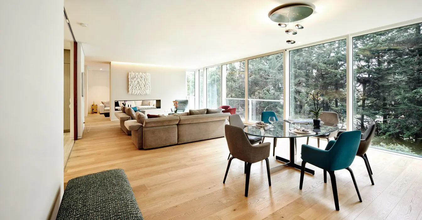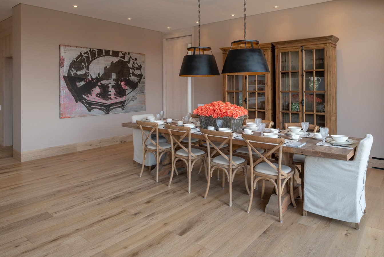 En uno de sus apartamentos optaron por el piso de roble europeo Glacial Bay, importado por la empresa J. Albornoz. Su generosa dimensión de 19 centímetros por 1,90 metros permite que el espacio se vea amplio y generoso; además, su tratamiento ahumado y termotratado le da un tono natural, perfecto para esta propuesta donde el entorno es lo principal. Todas estas piezas tienen un proceso de cepillado para generar un aspecto más artesanal.