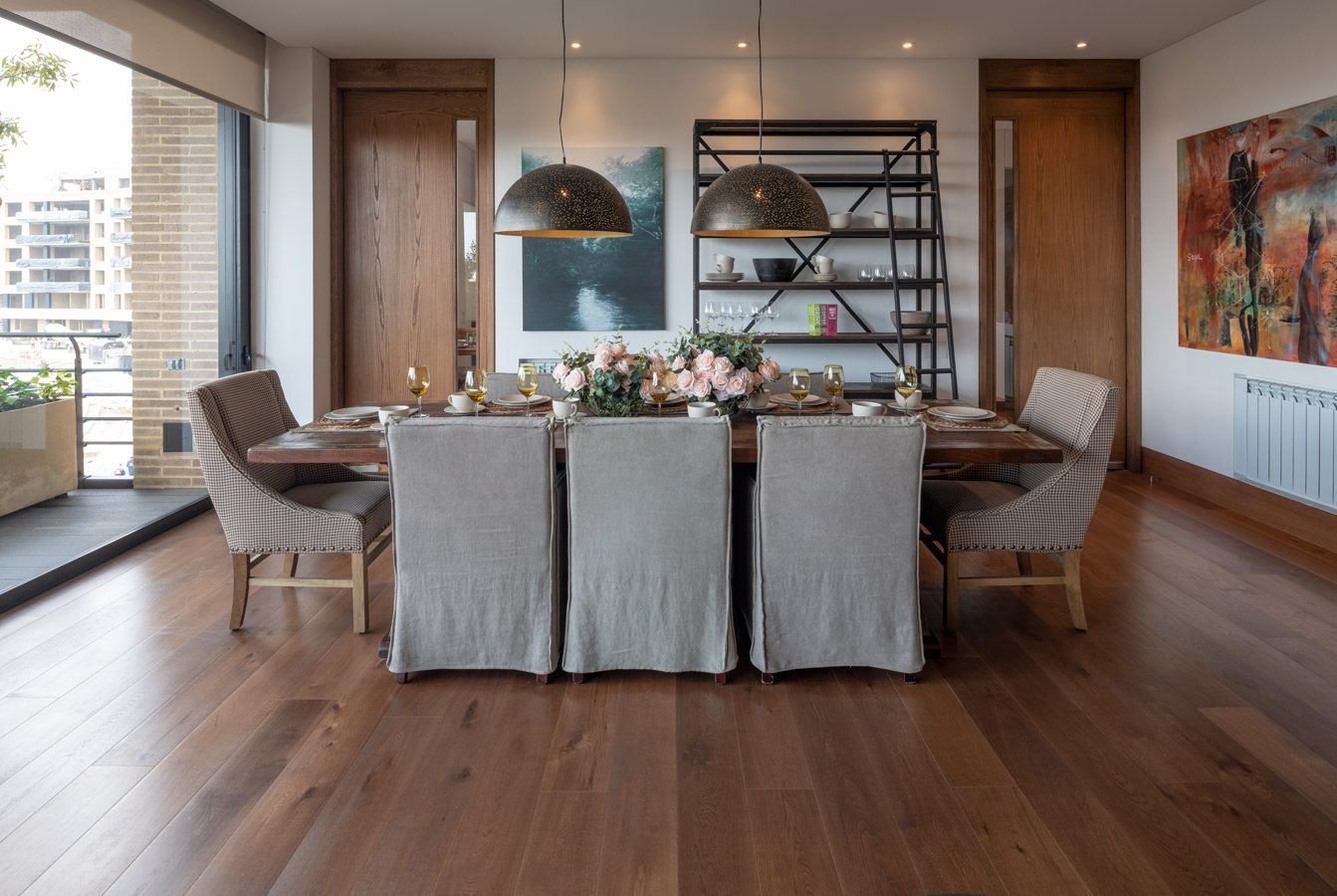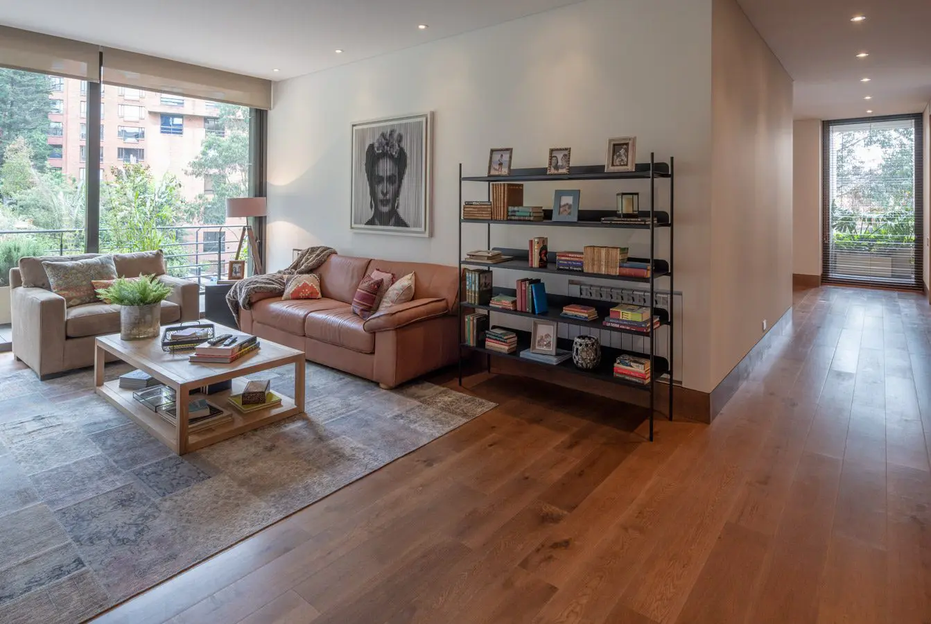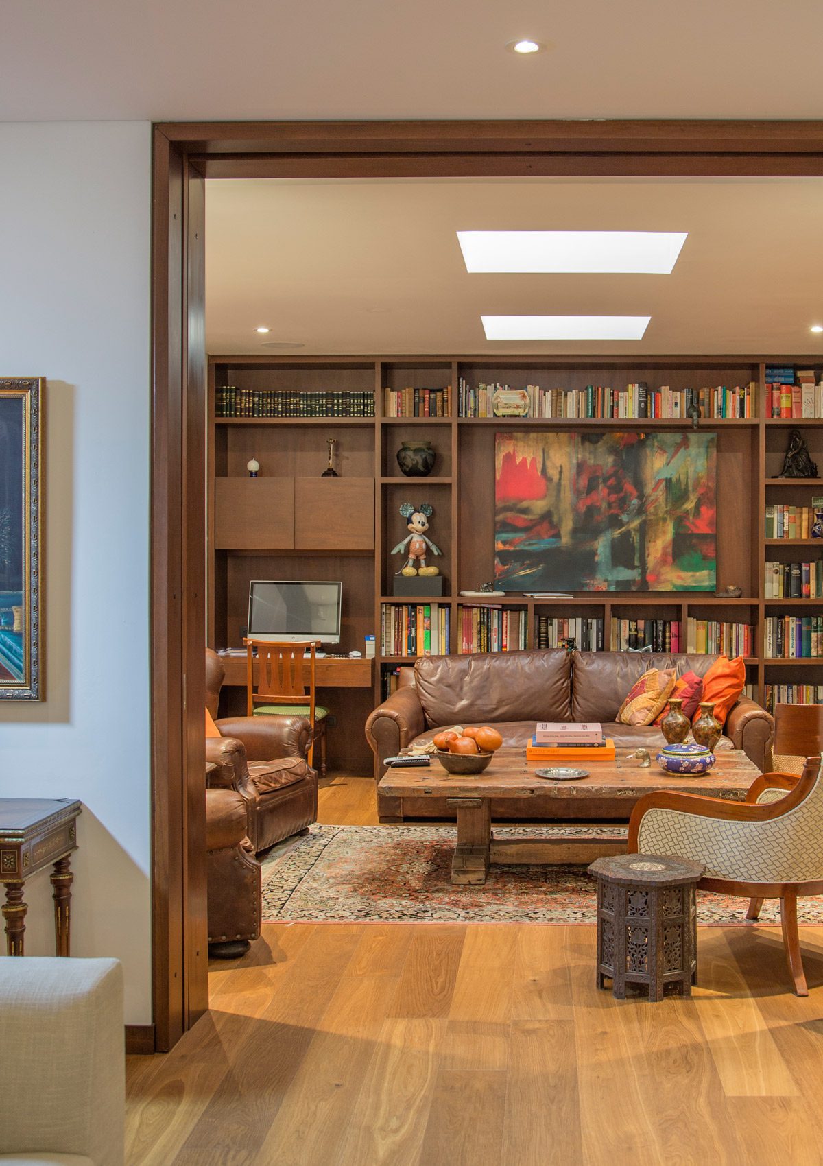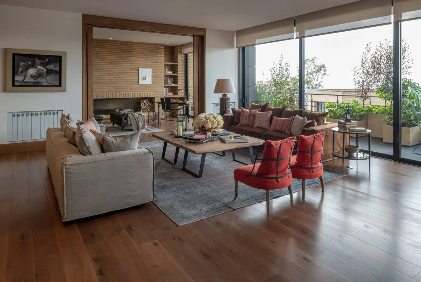 En este proyecto residencial, en Bogotá, el interiorismo se basa en una corriente clásica, reforzada por sus colores y mobiliario –donde la madera tallada predomina en diversos muebles–. Su gran estudio alberga desde múltiples libros hasta obras de arte, reflejo de las pasiones de sus habitantes. Para este apartamento optaron por un piso de ingeniería de alta especificación, de roble europeo ahumado –o madera maciza estructurada–, de la compañía Divano, el cual refuerza con sus colores y vetas la atmósfera de todos los ambientes, donde la tranquilidad y el descanso son las directrices. Este producto resalta por sus dimensiones: 18 centímetros de ancho por 2,20 metros de largo.
