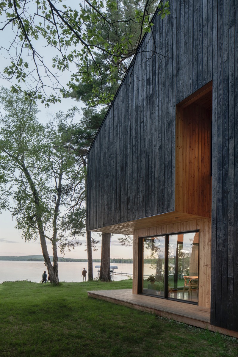 El revestimiento exterior está hecho de alerce tratado con dos métodos. Los tablones carbonizados se enfrentan directamente a los elementos y el aceite natural protege los tablones empotrados menos expuestos. Este juego de luces y sombras aumenta el aspecto singular de la casa.