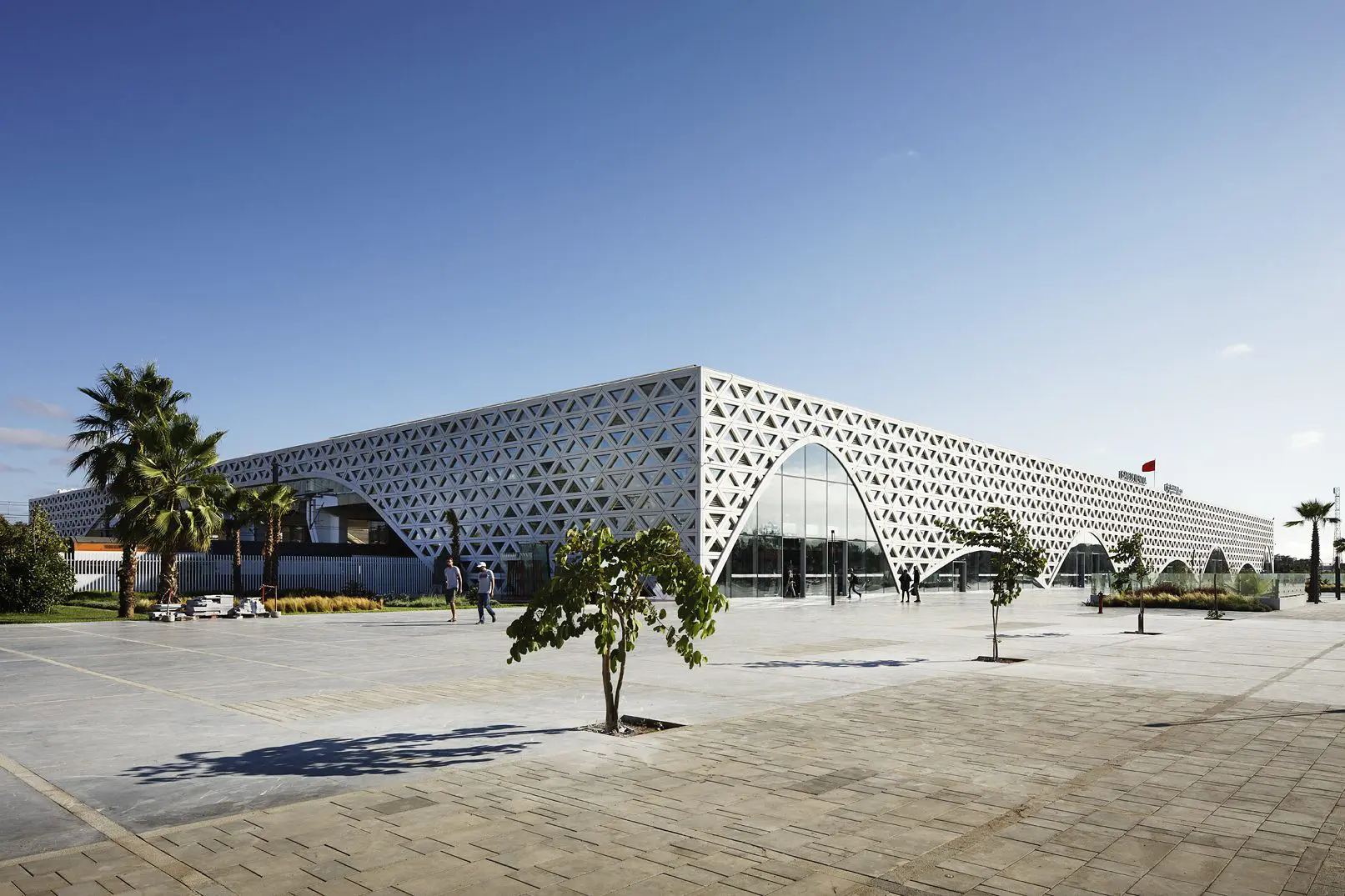 El sistema estructural constituye la expresión del edificio. El volumen prismático de 200 metros de longitud y 12 de altura se reviste con un cascarón de bloques triangulares perforados de concreto de alta resistencia, que permiten el paso de la luz y aportan al control climático en las diferentes estaciones del año. La geometría de este patrón repetitivo reinterpreta la celosía, propia de las construcciones del mundo árabe, como un elemento a gran escala.