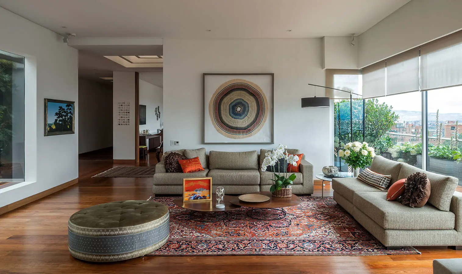 Inicialmente, el patio estaba pensado como área interior cubierta, pero al final decidieron abrirlo y llenarlo de esculturas y vegetación. Su presencia amarra la vivienda al entorno natural y hace olvidar completamente la altura en la que se encuentra. Frente a él, al otro costado de la zona social, se extiende la interminable terraza que acompaña todo el apartamento y que ofrece una vista privilegiada de Bogotá. En su totalidad, las zonas están expuestas hacia esta panorámica, tanto en el piso social (arriba) como en el área privada de habitaciones (abajo), hecho que ofrece las ventajas de vivir en la ciudad y al mismo tiempo sentir que se está fuera de ella.