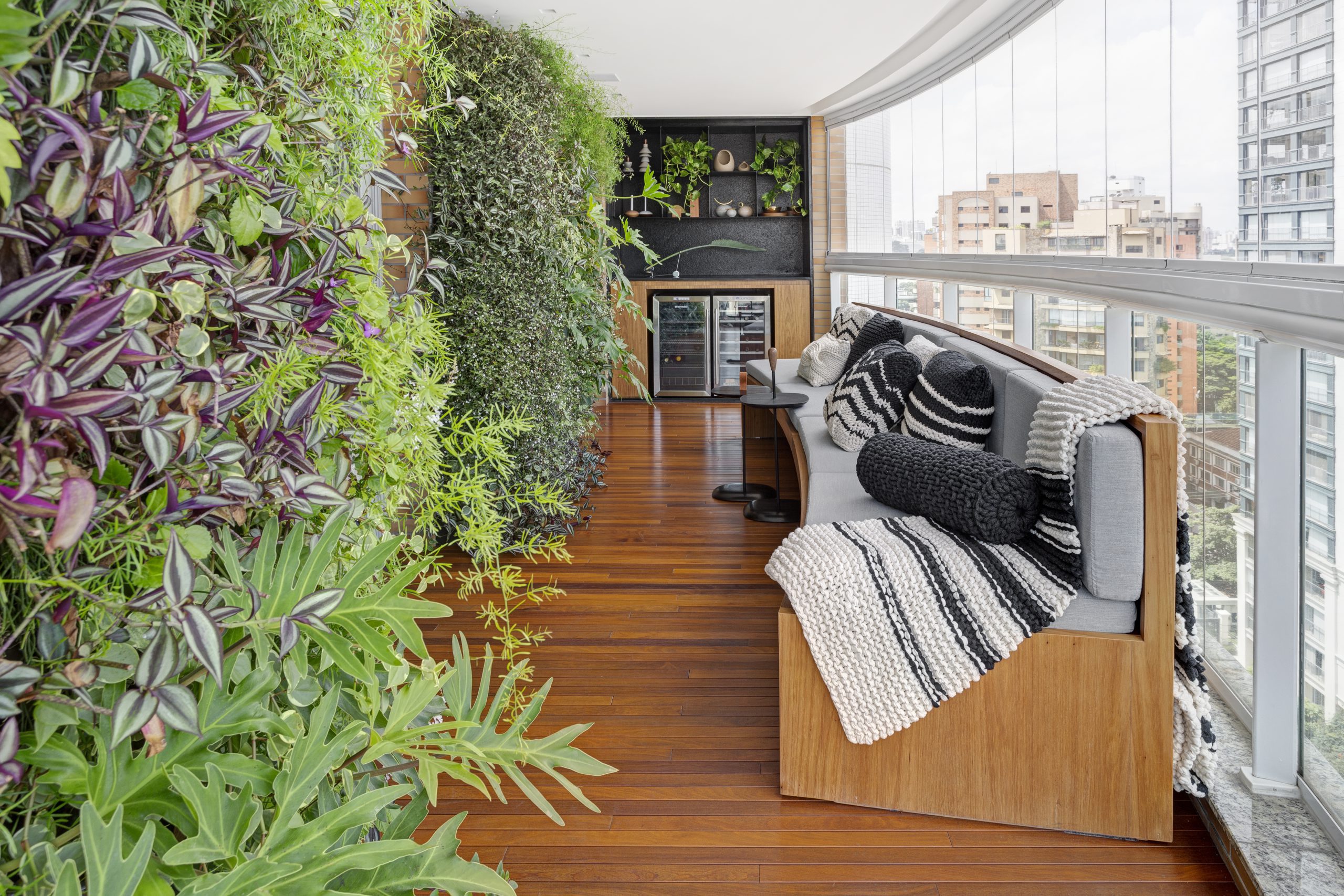 Los arquitectos crearon muros verdes en el área del balcón, cada uno con un sistema de riego automatizado independiente. Sin lugar a duda, son ahora los protagonistas de este sector. Por su parte, el piso de madera cumarú, el paisaje cercano y los dos grandes bancos curvos dan una cálida bienvenida. El remate está en las estanterías de piedra y metal, donde su tono oscuro pone el toque de sofisticación.