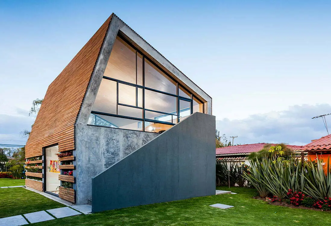 Esta obra de 152 metros cuadrados destaca de la arquitectura campestre tradicional que la rodea, sin desentonar. Inspirada en la idea de una cabaña con una cubierta inclinada asimétrica, las superficies longitudinales están enchapadas completamente en madera, mientras los frentes transversales descubren la estructura de concreto a través de ventanales de diseños geométricos.