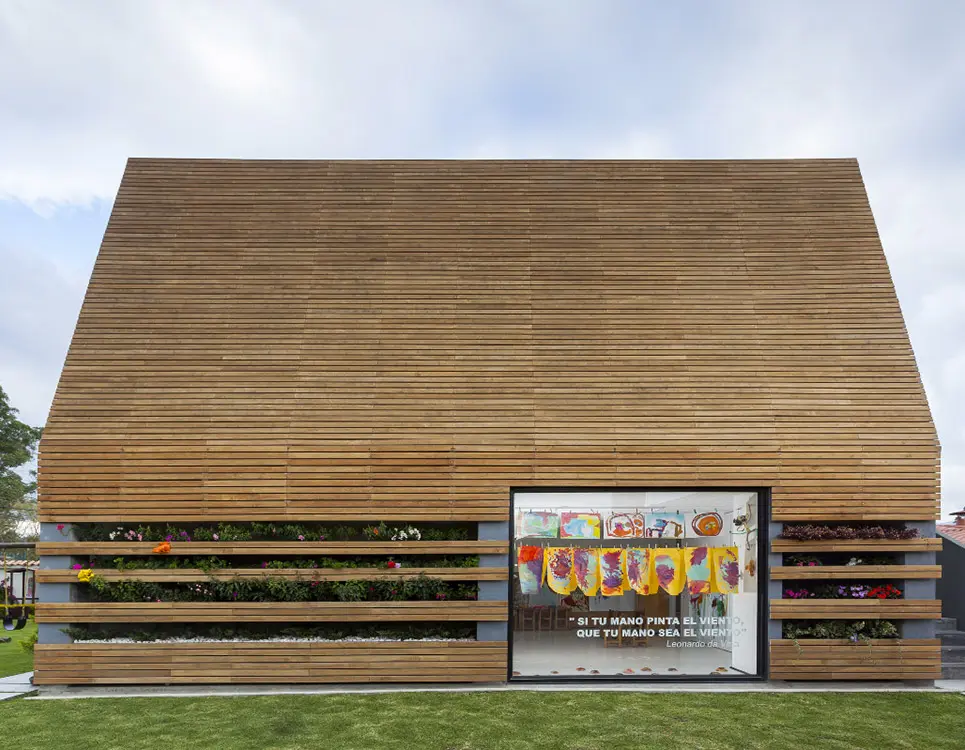 En la fachada principal un jardín vertical de plantas y flores enmarca la vitrina que exhibe los trabajos de los niños, mientras que en la posterior del segundo piso un par de ventanas encuadran las montañas.