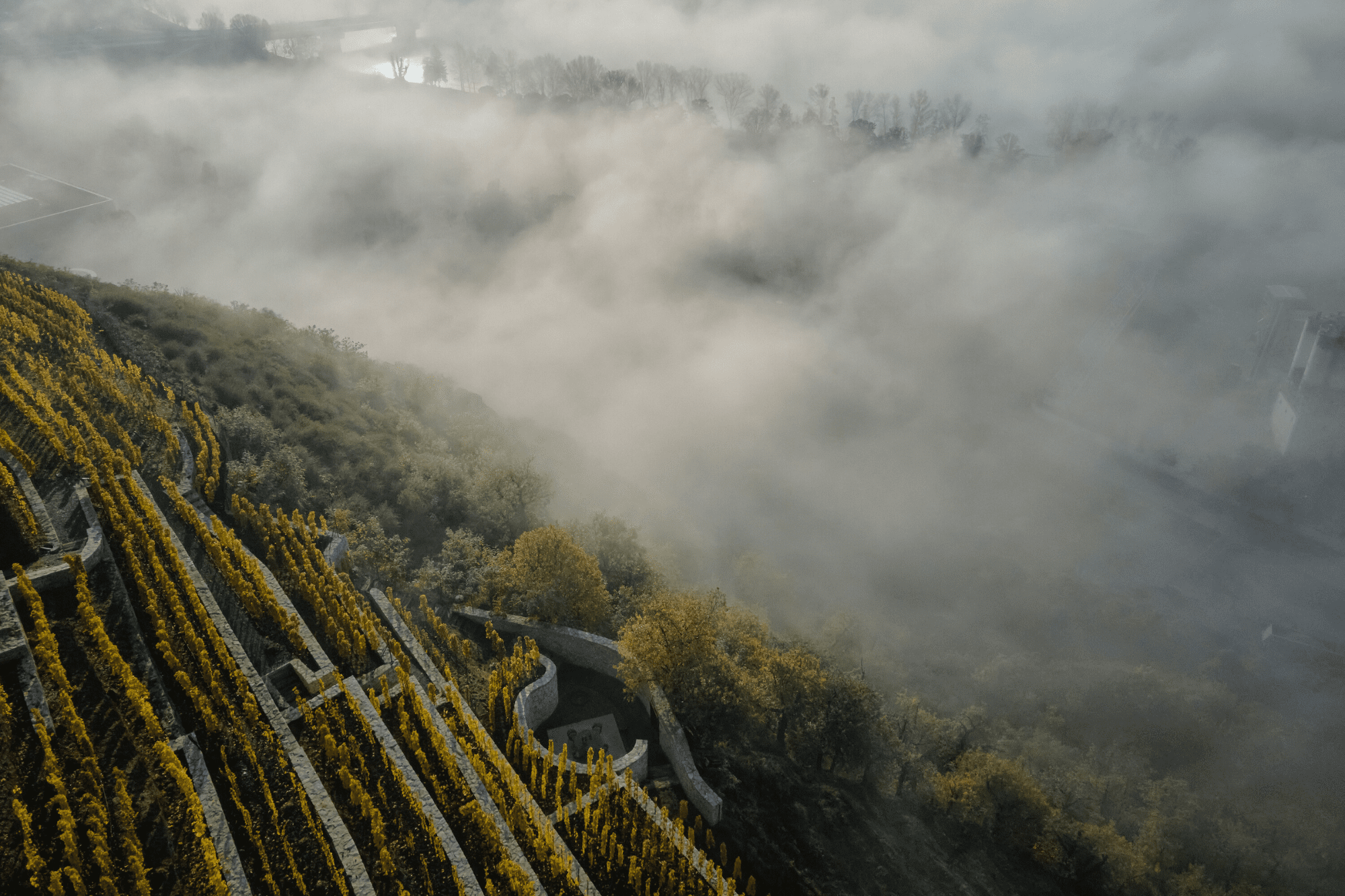 Olvidada en el viñedo en terrazas, se descubrió una ruina de piedra con un espacio curvo. Dado que la ruina se integró sutilmente con el paisaje, se convirtió en la base de la intervención. El genius loci – según la concepción romana es la esencia o carácter del lugar- sugirió el movimiento Espiral de Fibonacci que estaba perfectamente alineado con la ruina existente.