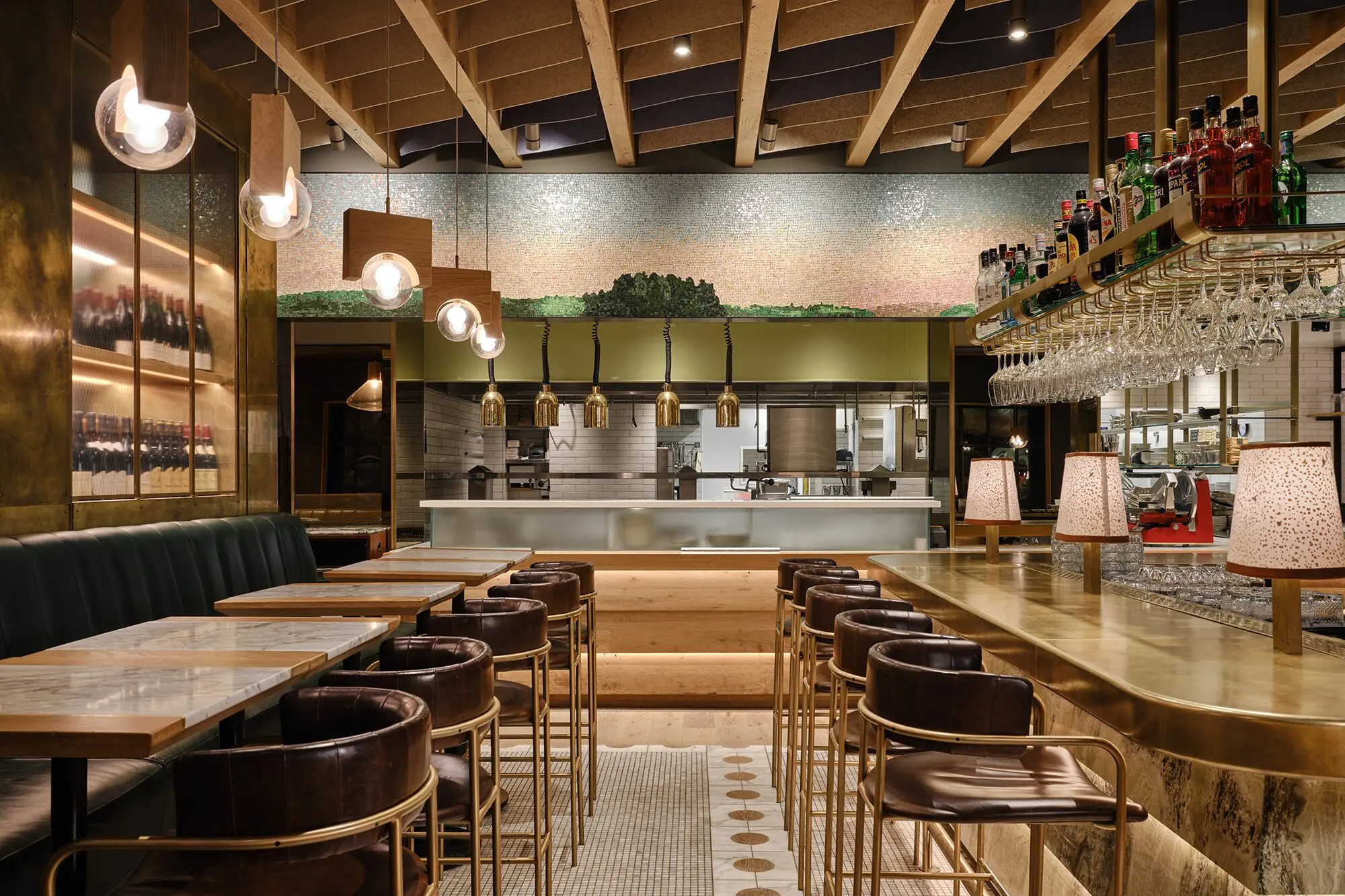 Así como abundantes estantes y mostradores exhiben ingredientes crudos y comestibles, y el restaurante sirve platos artísticamente terminados, Giannone Petricone introduce materiales y elementos arquitectónicos interpretados en grados desde lo poco refinado hasta lo refinado. Esta progresión se desarrolla a medida que uno pasa del mercado de la planta baja y la tavola calda de autoservicio a las experiencias de bistró, bar y eventos en el segundo y tercer nivel.
