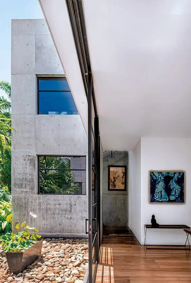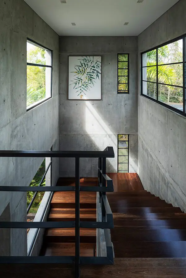 “Quisimos que los materiales de la casa se vieran poco procesados”. Por esto, en su gran mayoría, se exponen en su estado natural: estructura a partir de pantallas de concreto a la vista, combinadas con columnas puntuales de tubos petroleros; piedra pizarra para los pisos exteriores, y madera de campano y de nato para los interiores, distribuidos en grandes listones de 40 y 60 centímetros de ancho. Todos muestran sus colores y texturas originales.Desde esta casa frente al cañón del consota en pereira puede ver los mejores atardeceres del país