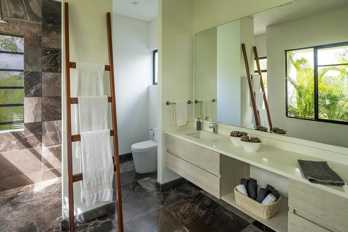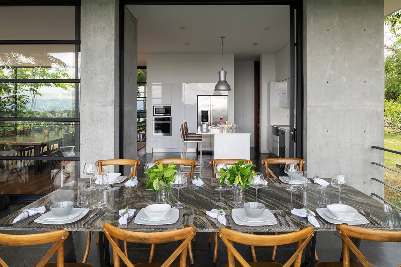 La ventanería, definida en aluminio negro y con una modulación repetitiva, responde a un deseo expreso de sus propietarios. Las barandas y demás elementos metálicos continúan el lenguaje planteado por esta. A su vez, la mesa del comedor está construida con una sola pieza de madera de campano. “La tuvimos guardada muchos años en una bodega, esperando el momento de tener la casa lista para mandarla a hacer”. Un camino similar recorrió la del exterior, hecha de una única lámina de mármol iraní, con un juego intenso de vetas grises y negras. “La encontramos en una carretera. Se la compramos a un iraní que había tenido su negocio en Venezuela, pero luego se había venido a vivir a Colombia, y así llegó a nosotros”.Desde esta casa frente al cañón del consota en pereira puede ver los mejores atardeceres del país