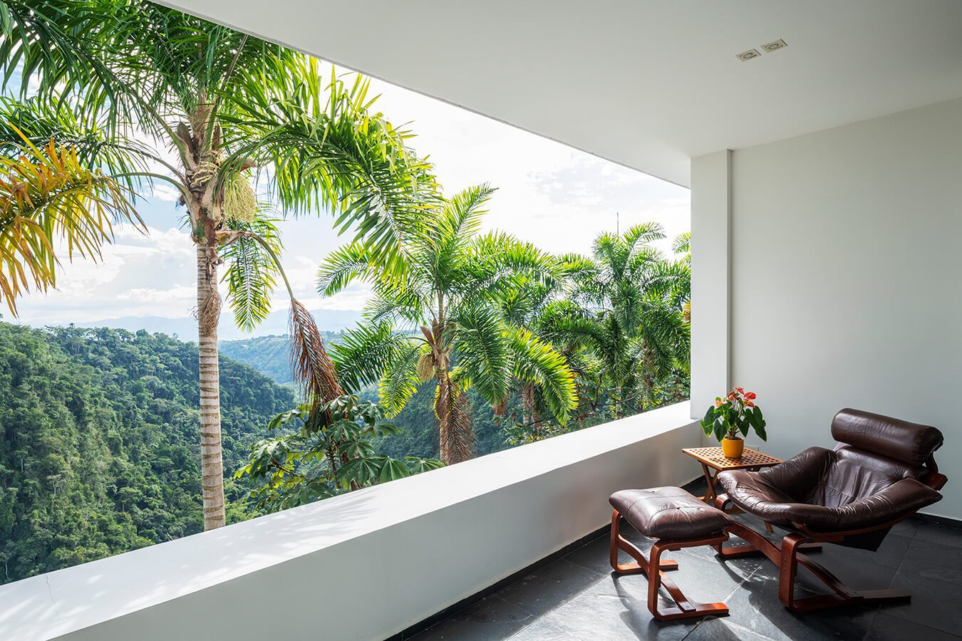 “Quisimos que la casa se ubicara lo más cerca posible del cañón para dar la impresión de estar sobre el precipicio. El hecho de que tenga dos pisos aumenta esa sensación”. En la segunda planta, la habitación principal y la alcoba de la hija se distribuyen a lado y lado del balcón central –siguiendo la simetría del primer nivel–. Este volumen se proyecta sobre la terraza exterior a manera de cubierta, para resguardarla del sol de poniente, hacia donde se orienta para disfrutar la vista. “La casa es una fábrica de atardeceres. Según avanza el día la vivienda permite que uno se mueva con el sol. De la sala se pasa a la terraza, luego al área del jacuzzi, que está mejor protegida”. Los ciclos de la naturaleza, que definen los ritmos de los habitantes de este hogar, integran aún más los espacios construidos con su entorno.Desde esta casa frente al cañón del consota en pereira puede ver los mejores atardeceres del país