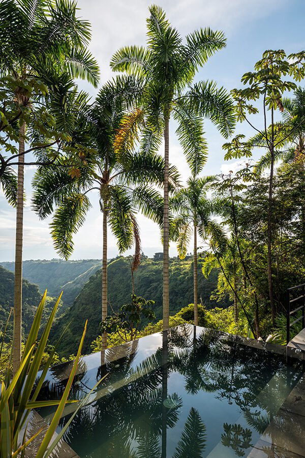 A la vivienda se ingresa por la parte posterior, a través de un tupido bosque compuesto por guaduales, yarumos y palmas zanconas, vegetación autóctona caracterizada por su intenso verdor. “Queríamos algo muy verde y de la región, sin flores ni otros colores”. Después de atravesar el denso bosque se llega a la construcción, y de repente la vista se abre ininterrumpida hacia el cañón. El primer piso es totalmente transparente, con las zonas sociales (salón-comedor-cocina) integradas y expuestas a la panorámica. Una terraza continua con piscina, opuesta al acceso y flotando sobre el cañón, remata estos espacios.Desde esta casa frente al cañón del consota en pereira puede ver los mejores atardeceres del país