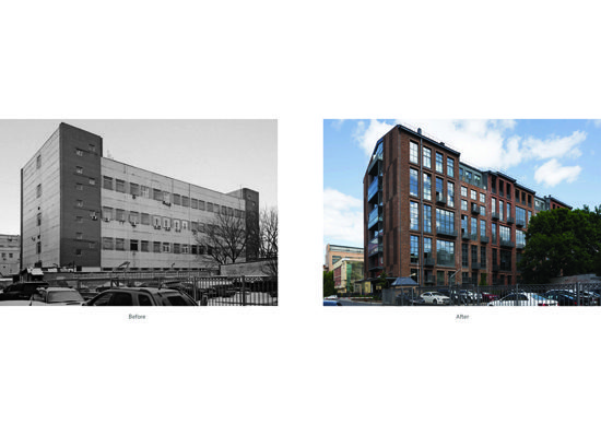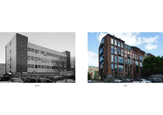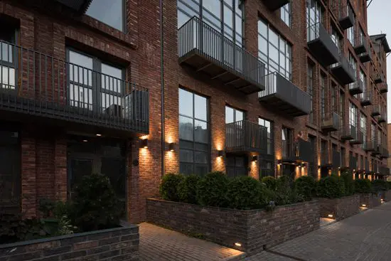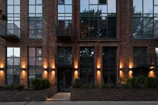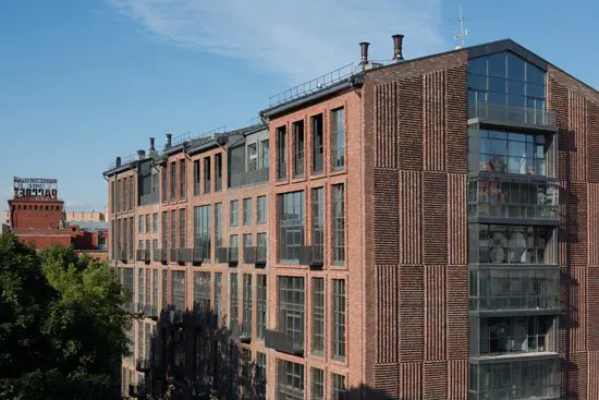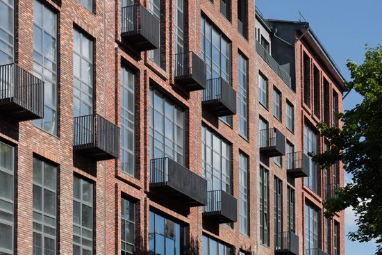 Convertir una fábrica en un edificio de apartamentos sin perder la identidad del lugar, ni su historia no fue tarea fácil. Comenzaron quitando algunos paneles frontales de concreto que fueron reemplazados de a poco por los ladrillos prefabricados y las fachadas se dividieron visualmente como si fueran casas individuales de estilo medieval. En los dos extremos del hastial grande del bloque, se ha realizado un corte acristalado en el centro para permitir que entre mucha luz en los apartamentos. Los patrones acanalados de ladrillo a ambos lados crean un juego de luces y sombras en toda su superficie.