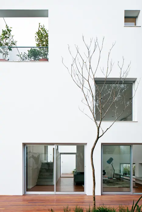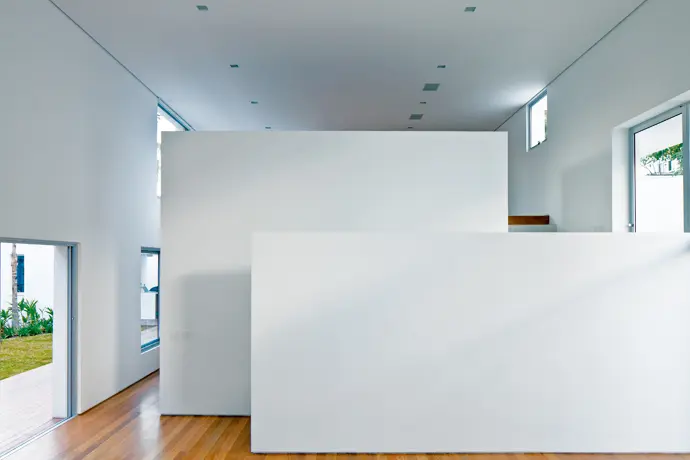 En la práctica estas posturas se traducen en una serie de perforaciones en distintos niveles y en la creación de un espacio de doble altura ocupado por la sala de estar, que logra conectar el interior con el jardín al fondo de la casa gracias a la supresión del antiguo garaje en el nivel inferior. Sin embargo, estas alteraciones, que se expresan en la fachada como perforaciones de distintos tamaños y posiciones, no rompen el volumen original, sino que lo refuerzan ya que prima la presencia del muro blanco como constante. El proyecto se vuelve monolítico y abstracto.