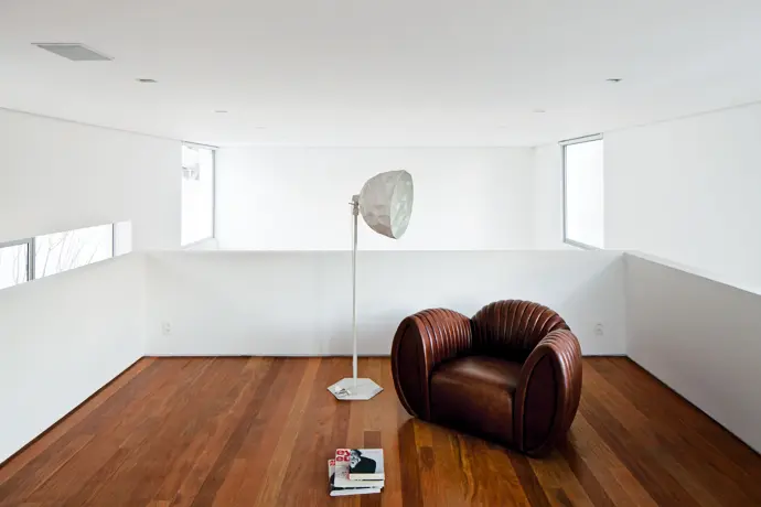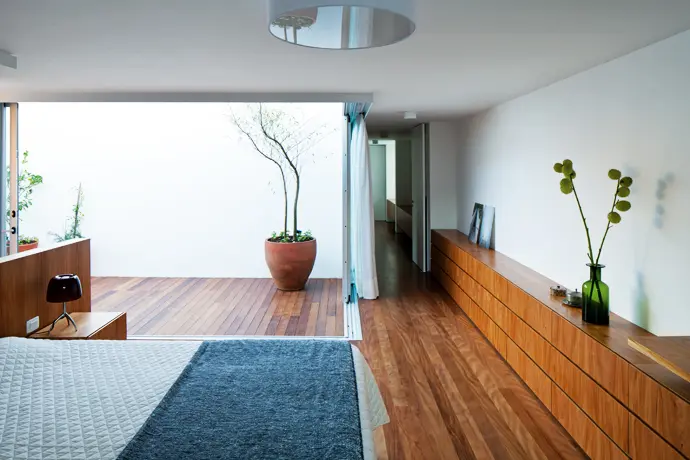 Junto al dormitorio principal, este se muestra como un recorte de la alcoba, donde la continuidad entre interior y exterior es máxima gracias al diseño de las ventanas corredizas, que liberan prácticamente todo el límite entre dormitorio, corredor y exterior, generando una potente conexión en diagonal. La continuidad del piso de madera contrasta con el blanco, presente en toda la casa. Incluso, en el jardín y el patio delantero también termina de cerrar el vínculo entre estos dos subespacios, dando como resultado un único espacio.