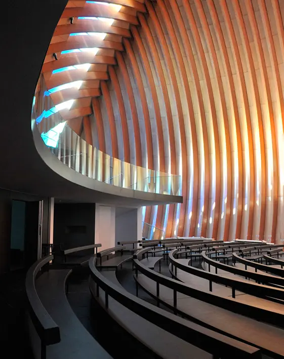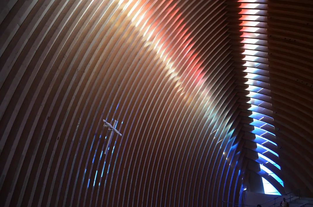 Los dos estilos arquitectónicos establecen un diálogo entre sus diferentes geometrías. La nueva cúpula que apunta hacia al cielo y de gran volumen, se basa en la plana de la catedral original. Al ingresar, la nave compuesta por dos cúpulas se extiende desde dos cubiertas de madera esférica que se unen como dos manos sobre el altar, listas para rezar.