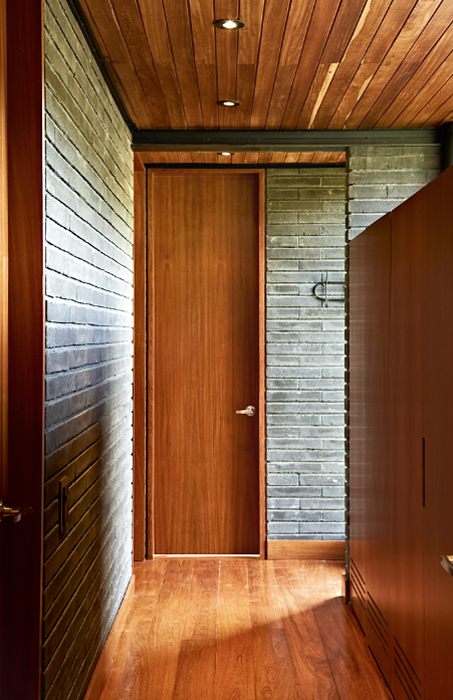 Resuelta en 150 m2 en función de las necesidades del fotógrafo, su esposa diseñadora y su hijo, la casa combina su apertura hacia el paisaje con el sentido de calidez que dan los muros interiores de ladrillo a la vista y los pisos y cielorrasos de madera. Estos se complementan con toques blancos en el amoblamiento y con el acero en los accesorios y la dotación de la cocina.