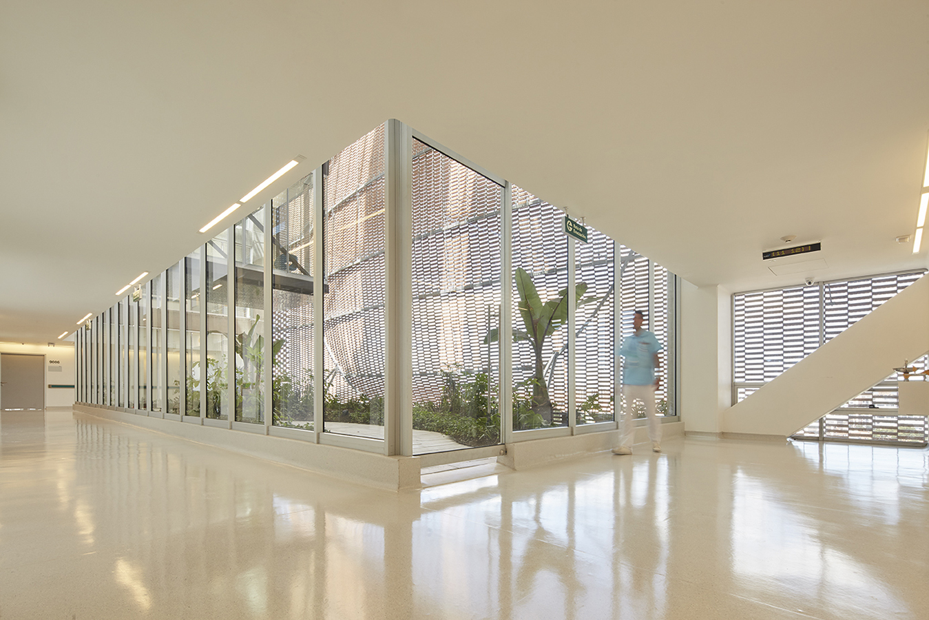 De lejos, camuflado dentro de una manzana completa del complejo hospitalario construido en ladrillo terracota, el edificio, diseñado por El Equipo Mazzanti, resalta, no solo por la utilización diferenciadora de este elemento que conecta La Fundación, sino que además, se caracteriza por su altura y rotación. Doce pisos que parecen flotar, giran 45 grados dándole la espalda a sus antecesores y mostrándole la cara a la cuidad.