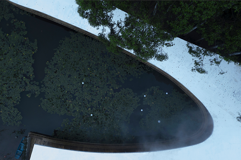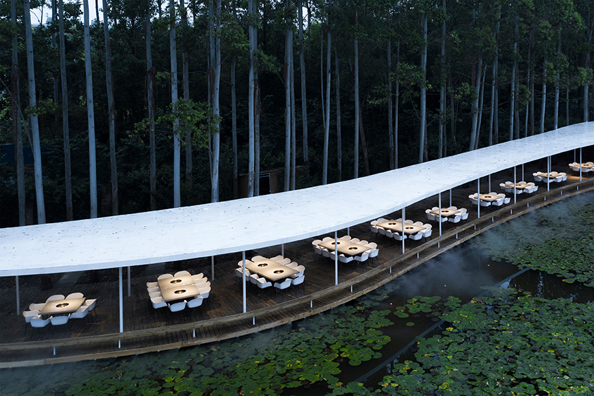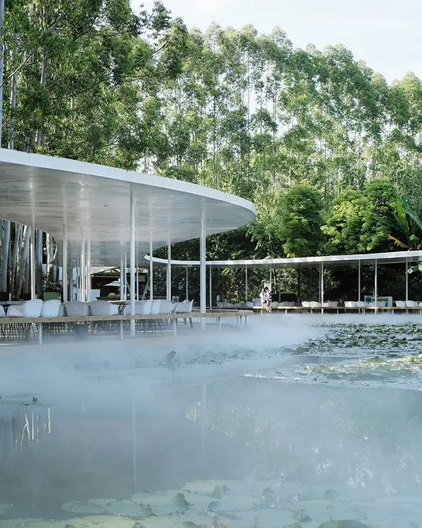 Como una gran banda lineal sin muros de fachada, el proyecto hace un recorrido que bordea un lago en medio de los árboles y orienta la mirada a la vegetación por un lado y al agua por el otro. Los comensales quedan inmersos entre dos mundos: un patio acuático vaporoso, y los sonidos y aromas de la arboleda. Estar adentro y afuera son aquí condiciones relativas.
