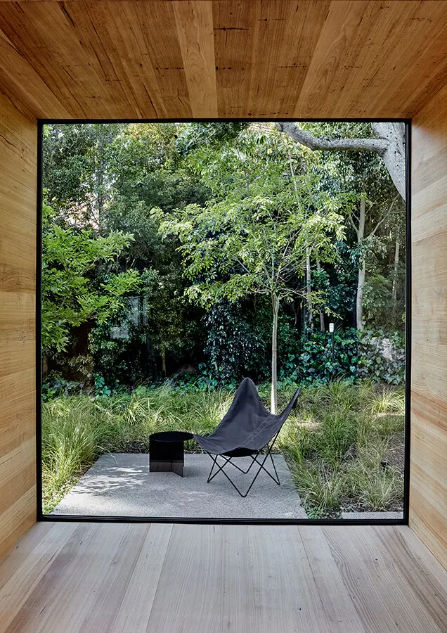 Por eso el arquitecto diseñó en el primer piso ventanas cuadradas que sobresalen, algunas de ellas pensadas para servir de asiento gracias a los paneles de madera que las componen. Además, enmarcan las vistas e integran los jardines interiores. “Son muy especiales para nosotros, un buen lugar para relajarse y leer el periódico”, comentan los dueños.