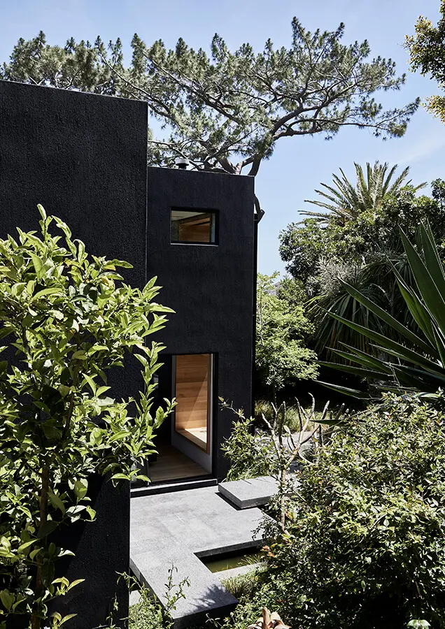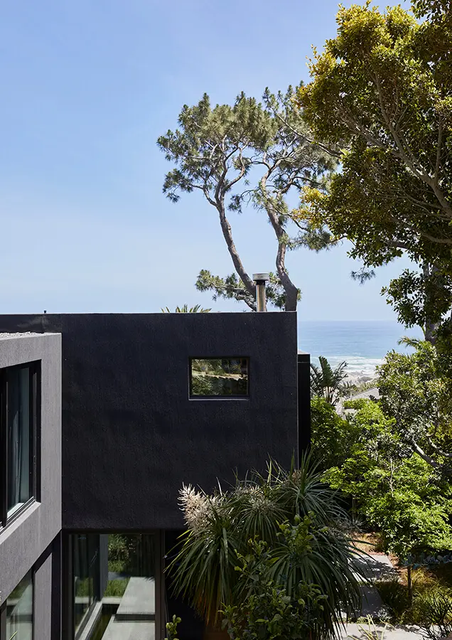 En una de las esquinas más frondosas del barrio Camps Bay, en Ciudad del Cabo, Sudáfrica –a 12 minutos caminando de la playa–, donde las casas dan hacia la calle, hay una estructura orientada en una dirección diferente, a unos 45 grados. El drama de su geometría inconformista se enfatiza por su fachada oscura, casi negra.