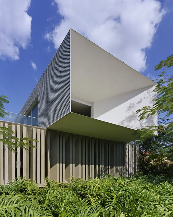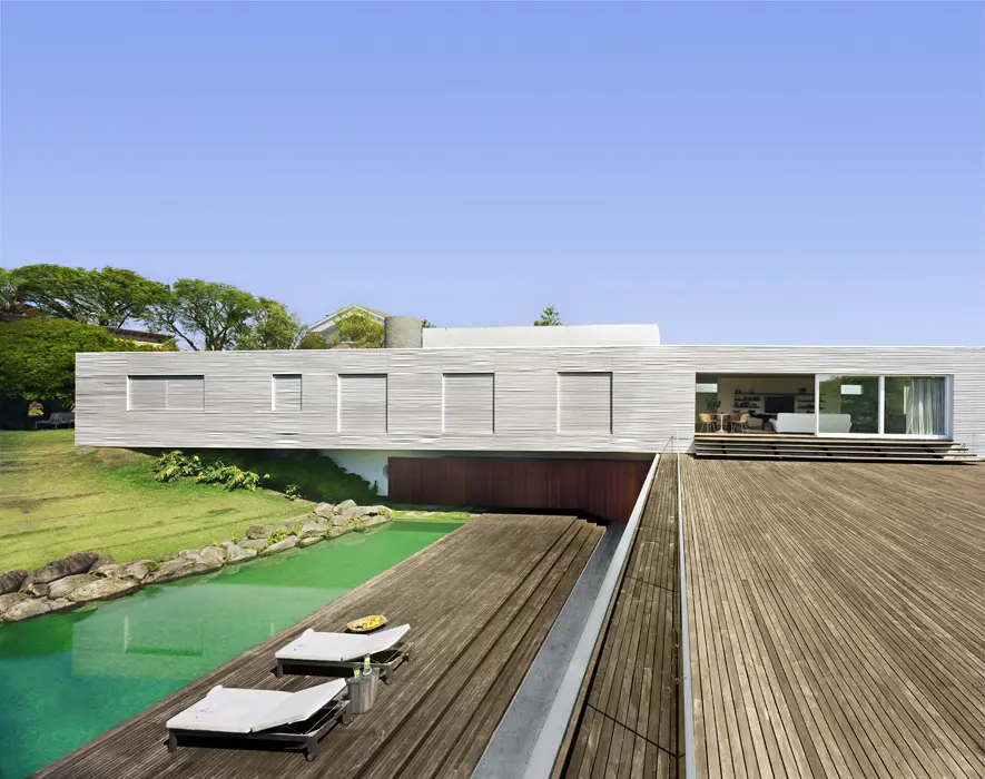 Orientada hacia la piscina, la zona social abierta integra el interior al exterior a través de un juego de puertas correderas y una terraza de madera que llega hasta el borde del agua, con el complemento de unas sillas Ayty 4802, de Saccaro. El ángulo que forman la zona social y el área de servicios enmarca la piscina. El frente sobre la calle está resguardado del sol y de las miradas indiscretas por una extensa pantalla tramada con tablones de concreto alineados de manera irregular a lo largo de la fachada.