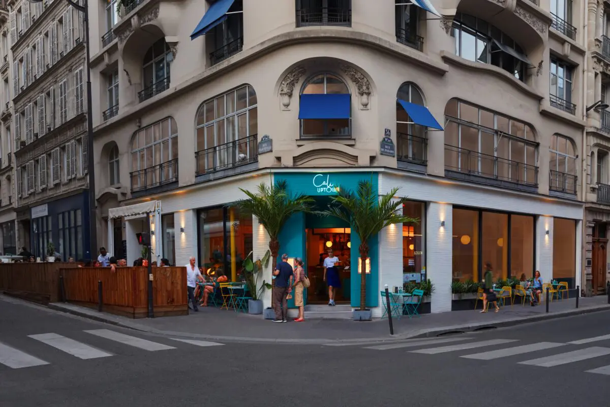 El exterior del restaurante destaca por su fachada de ladrillo, dispuesta en un patrón geométrico modernista y pintada del blanco más brillante. La entrada está flanqueada por columnas de color azul pavo real, que dan una alegre bienvenida al barrio de París. La arquitectura interior es minimalista, con las columnas estructurales del edificio desnudas para dejar al descubierto la pálida mampostería, sobre la que destacan los colores vivos de la tapicería y los accesorios sueltos.