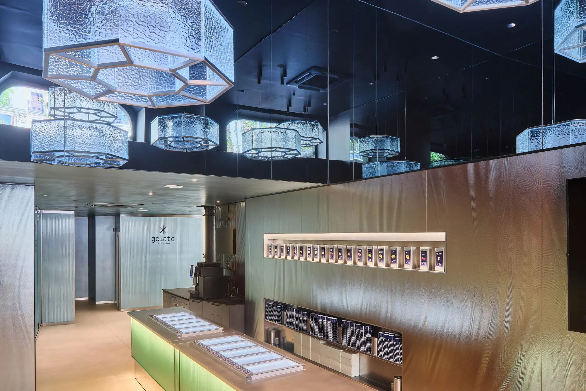 Desde el primer vistazo, Gelato Collection se percibe como un espacio donde la materialidad y la luz juegan un papel fundamental. El elemento central es su imponente vitrina de helados, concebida como una joya dentro de un escaparate. Su revestimiento en vidrio acanalado crea una sensación de frescura y pureza helada, destacando los vibrantes colores de cada creación de Adrià.