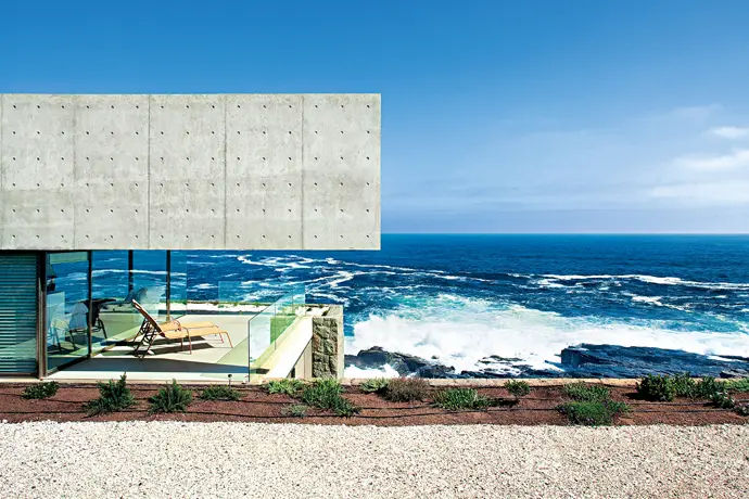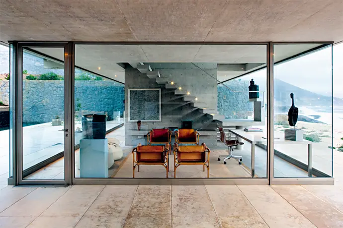 de veinticinco metros sobre el nivel del mar. Las condiciones del ventoso lugar, entre montañas rocosas y un mar embravecido, definieron los puntos de partida del proyecto. cuenta el arquitecto que “el sitio reclamaba una decisión arquitectónica radical (…) un nuevo orden en el paisaje”.