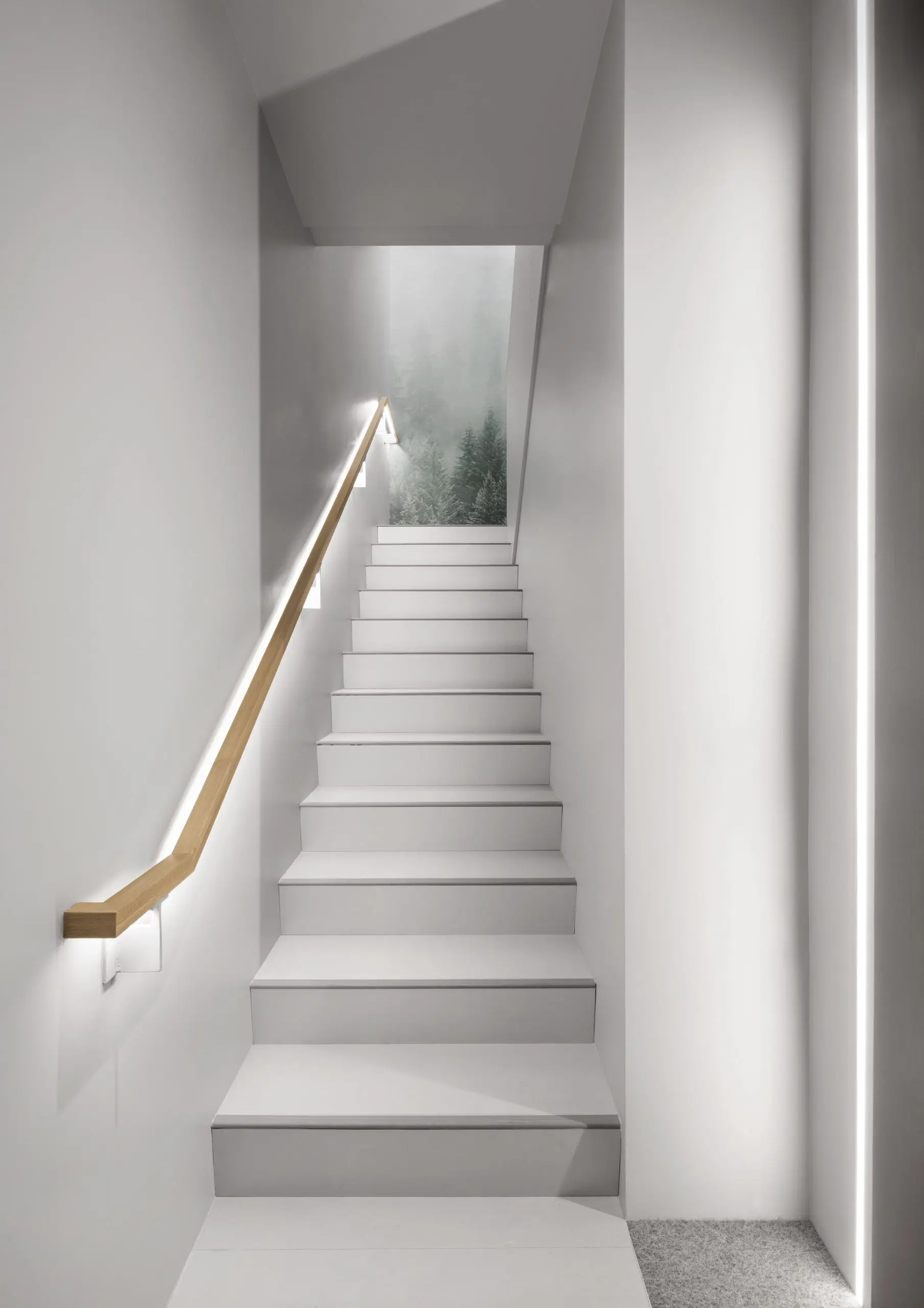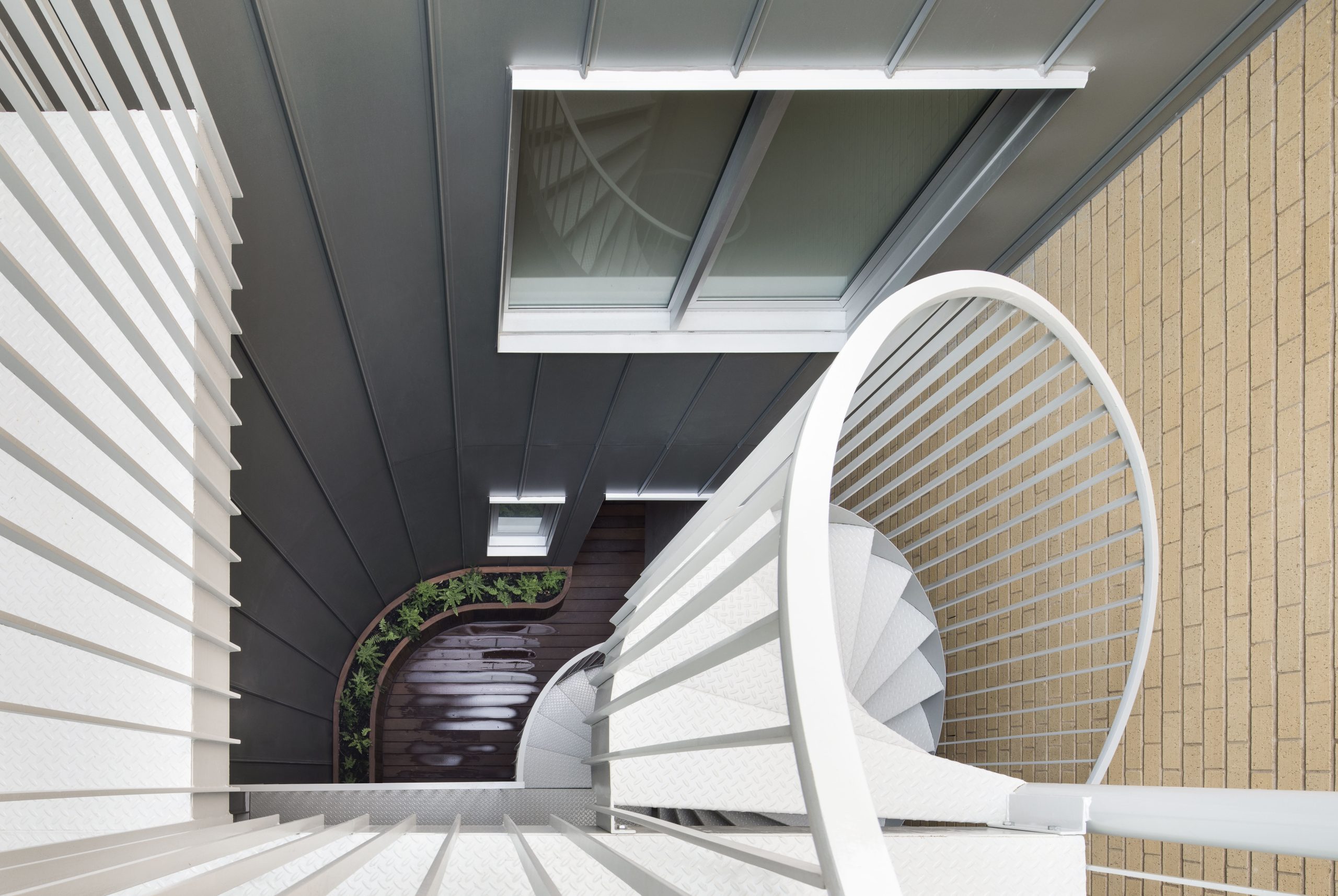 Los detalles sutiles de aluminio rodean las ventanas y las puertas, y las barandillas finamente perforadas se desvanecen en el fondo monocromático. Balcones totalmente acristalados se perforan en la fachada, lo que brinda a los inquilinos una mayor privacidad al mismo tiempo que simplifica la forma del edificio.