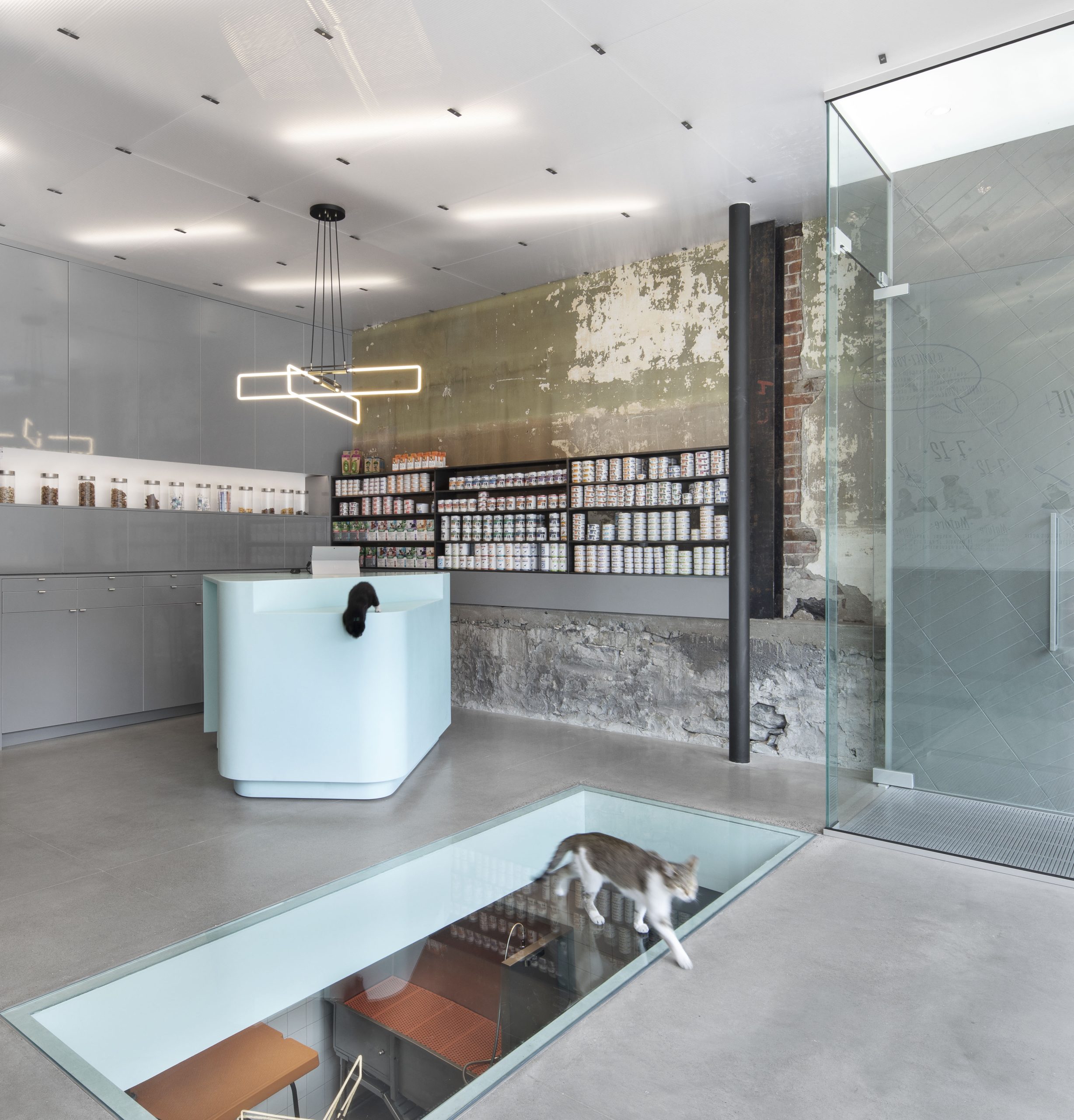 Al redefinir la experiencia veterinaria para el vecindario, el espacio cobra vida con una paleta de colores mínima –de colores relajantes– y una generosas particiones de cristales.