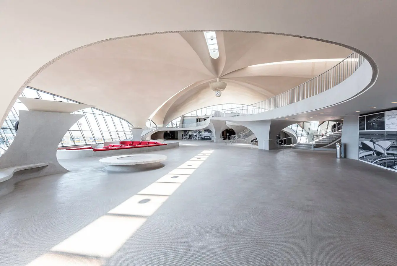 El edificio original, que data de 1962, es una joya de la arquitectura. Diseñado por el arquitecto estadounidense de origen finlandés Eero Saarinen (1910-1961), fue conocido como el TWA Flight Center y comisionado por TWA (Trans World Airlines) para celebrar el ápice de glamur y sofisticación de la aviación comercial. Ahora, el área principal de pasajeros ha sido remodelada como el corazón del hotel, con seis restaurantes, ocho bares, tiendas y una piscina en la azotea. Dos nuevos edificios, inspirados en la terminal, albergan las habitaciones. El interiorismo, al estilo de la década de 1960, incluye muebles originales de Saarinen, afiches vintage de TWA, uniformes de la tripulación y hasta teléfonos rotativos.