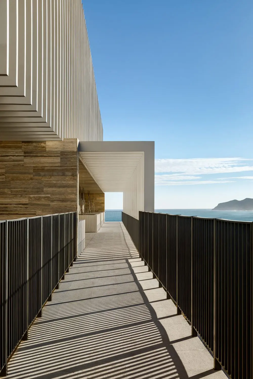 Dada la pendiente, cada terraza se eleva sobre la otra de manera escalonada, con fachadas orientadas al sur, lo que significa que todos los espacios disfrutan de espectaculares vistas al mar. Las comodidades que incluyen piscinas, club de playa, tumbonas se encuentran en el nivel más bajo, junto a la playa.