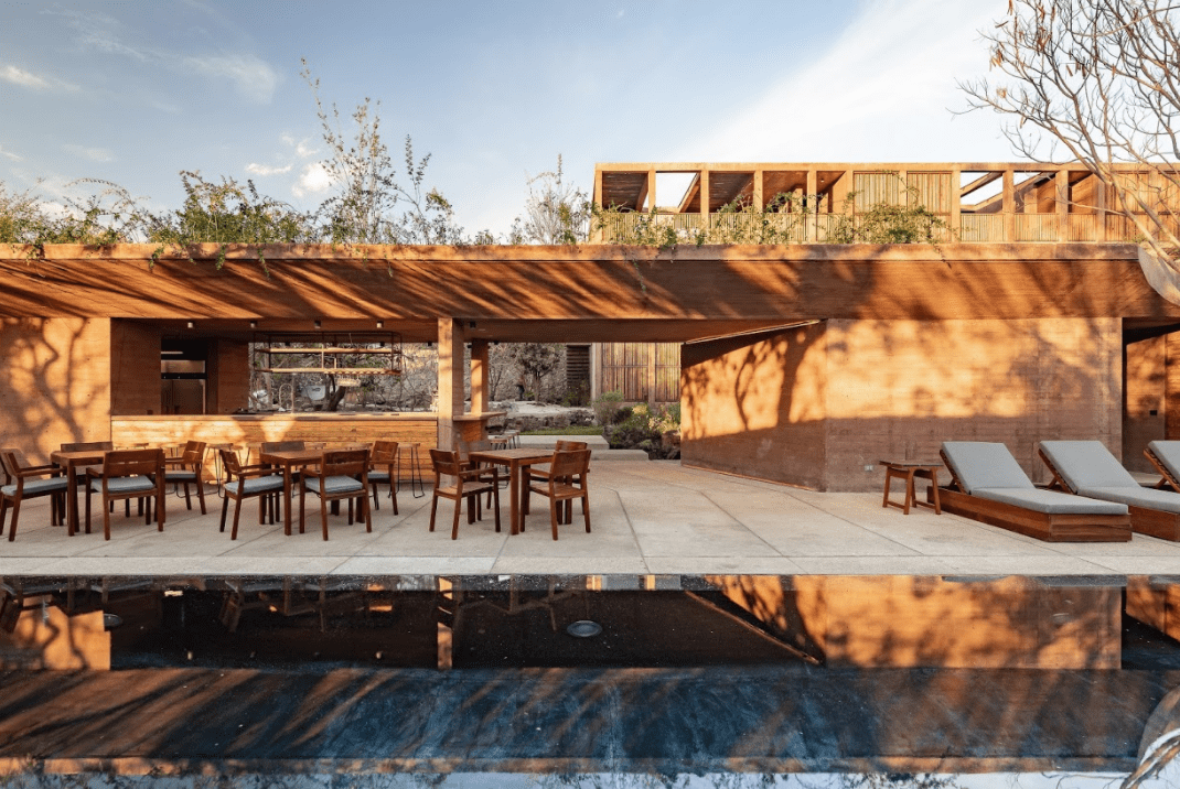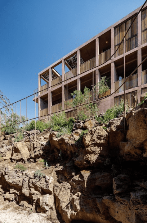 Algunos de ellos se cierran con persianas de madera para proteger del sol los alojamientos, mientras los correspondientes a las terrazas superiores quedan abiertos con el fin de reducir así la masa y el peso visual del edificio. En el primer piso, un salón de yoga y el restaurante funcionan como espacios para el encuentro.