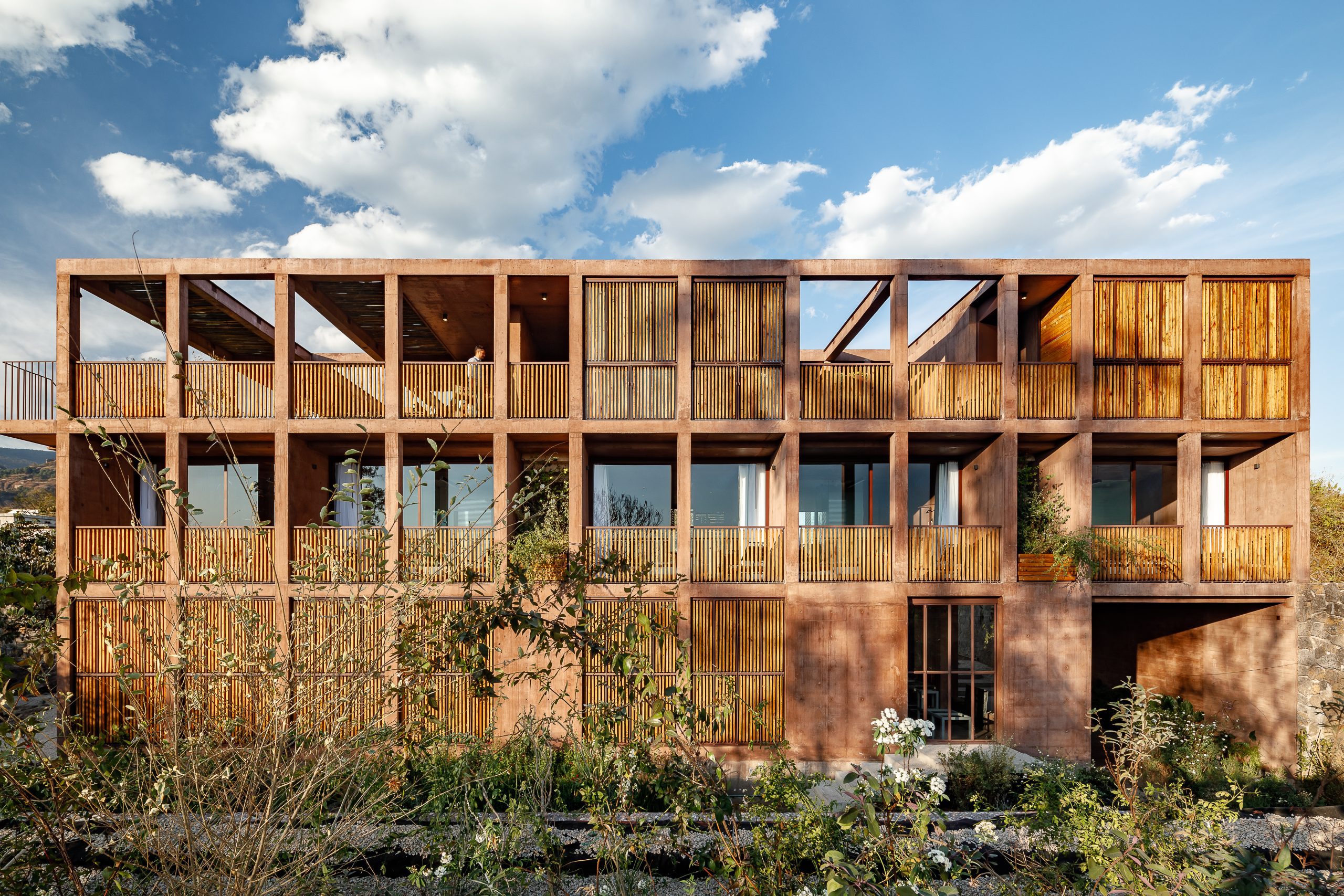Un primer cuerpo –que delimita el acceso a la parcela y recibe a los huéspedes– conforma un umbral que se entrelaza con los árboles existentes y deja ver las construcciones y jardines del complejo por medio de sus rejas. Al entrar, un patio de roca volcánica hace las veces de antesala a la estructura que contiene las habitaciones, mientras un pequeño edificio lineal de baja altura, destinado a la zona administrativa del hotel, lleva hacia uno de los bordes. La retícula de hormigón que define la fachada del volumen principal deja aparecer una secuencia de vanos rectangulares.