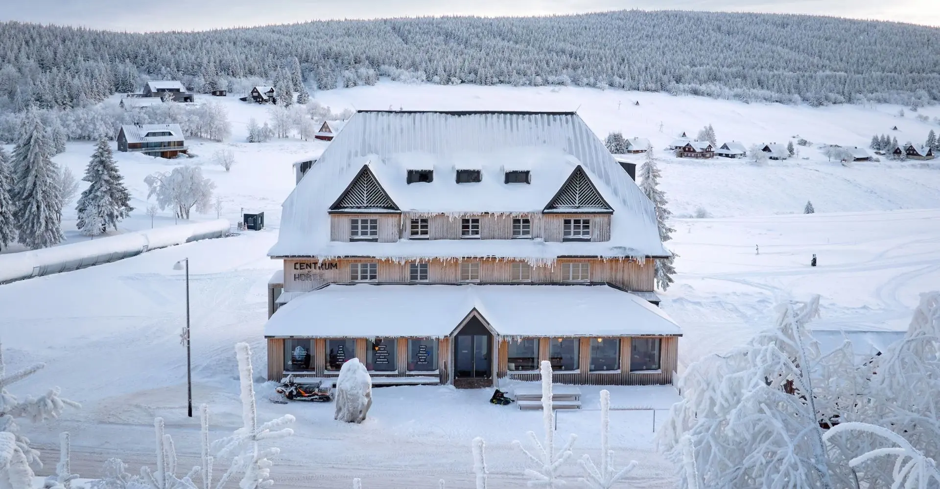 El pueblo se compone de varias zonas, y una de las más significativas, Pomezní Boudy en Horní Malá Úpa, alberga el nuevo Centro Hořec. Durante varias décadas, numerosos edificios en esta zona han sido diseñados por el estudio de arquitectura ADR en colaboración con el equipo local de la estación de esquí SKIMU, unidos por la ambición compartida de preservar la atmósfera y el carácter únicos de este paisaje montañoso.