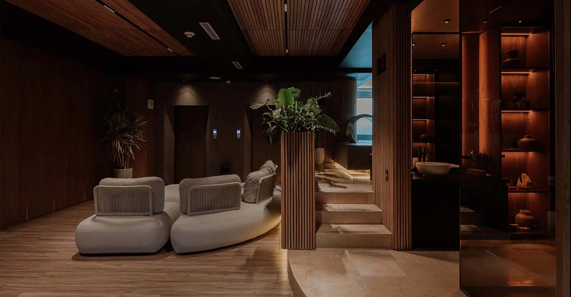 En la intervención se respeta la estructura original, pero se introduce un nuevo sistema de revestimientos en madera natural que abraza al huésped y transforma la atmósfera. A esa materialidad envolvente se suman el cuero, los acentos metálicos y una paleta de tonos tierra que aportan serenidad.