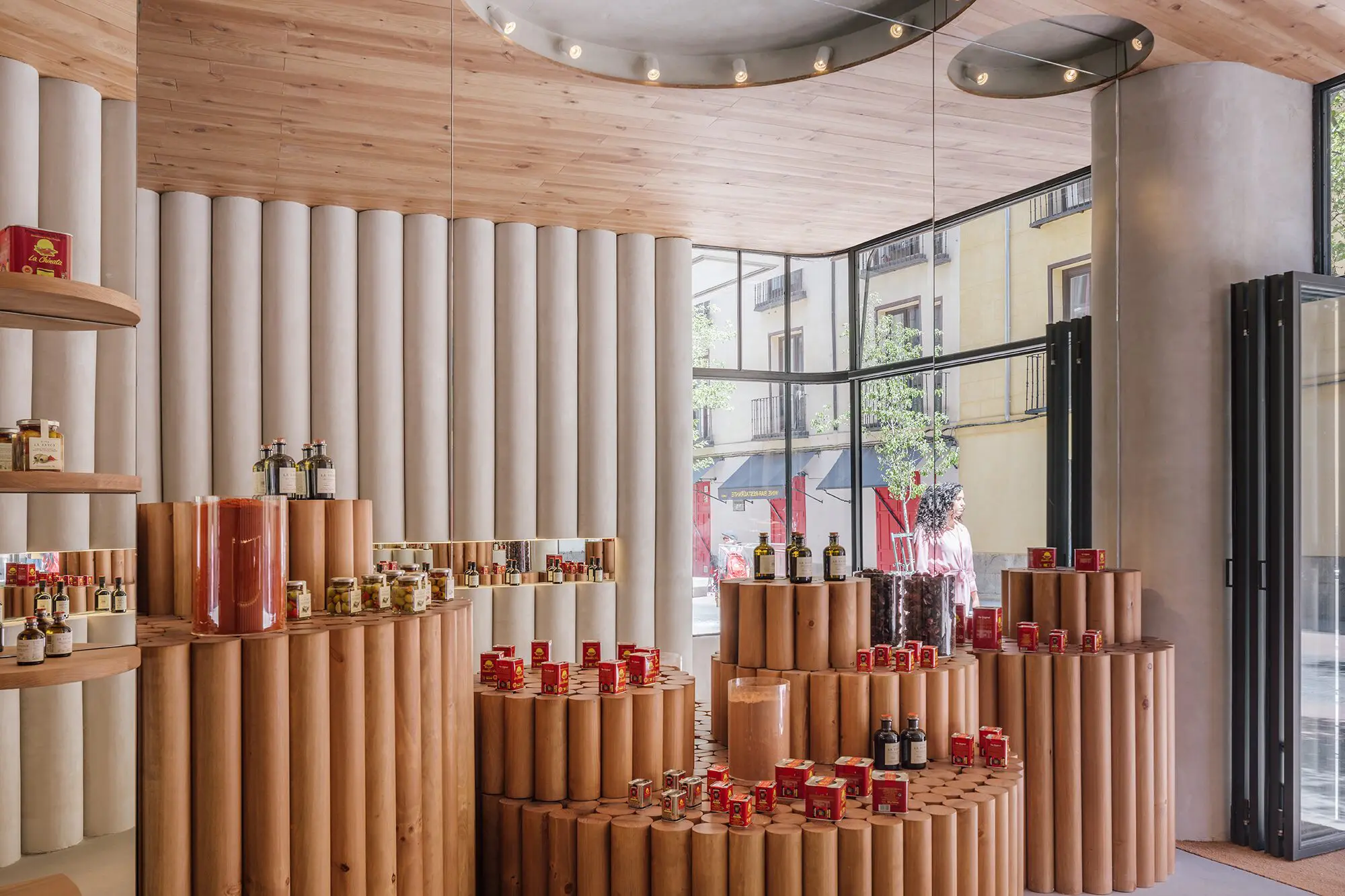 El interior de la tienda está compuesto por cilindros verticales que simbolizan los troncos y que actúan como expositores circulares para mostrar los variados productos de pimentón ahumado.