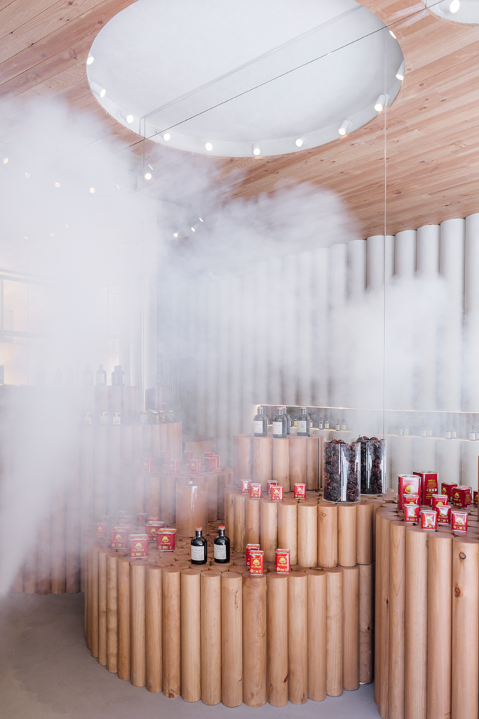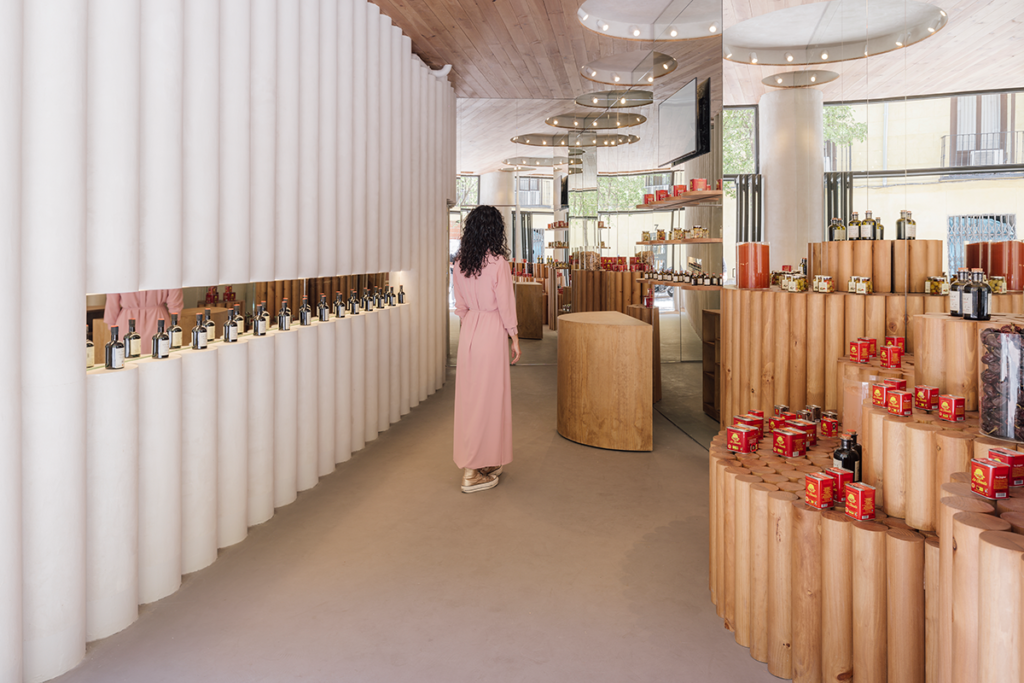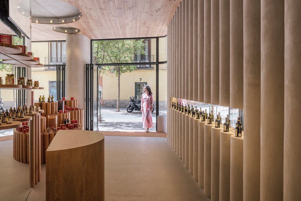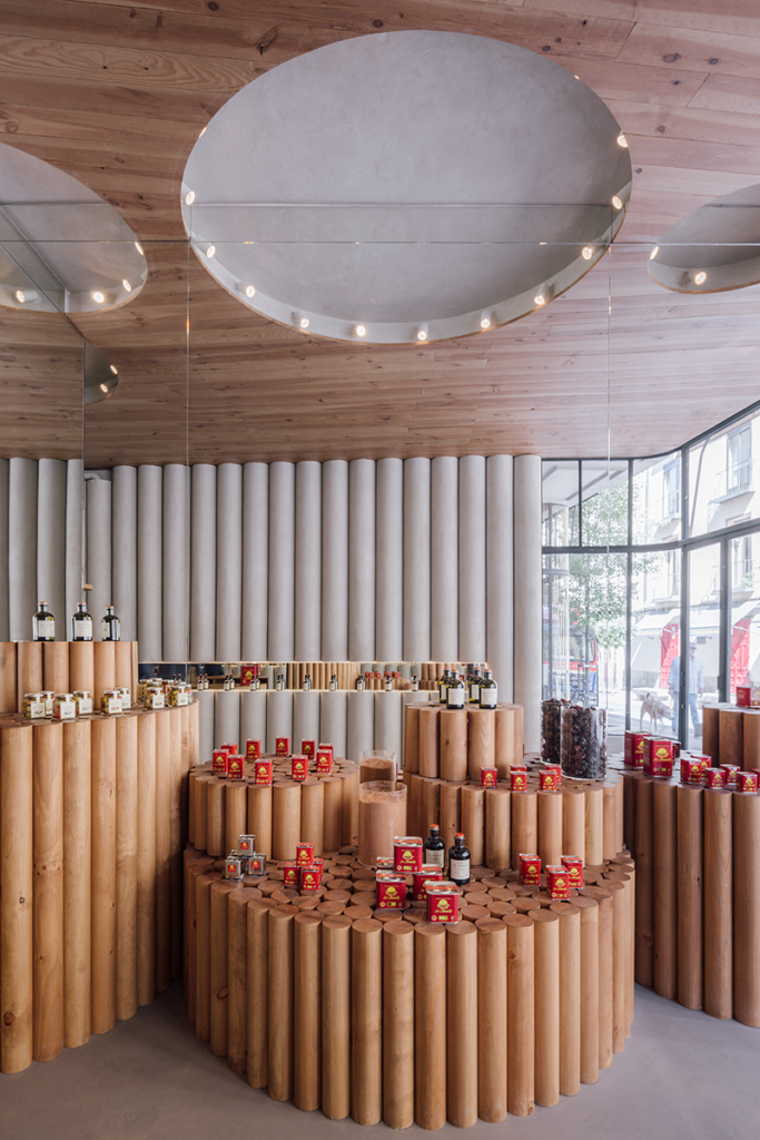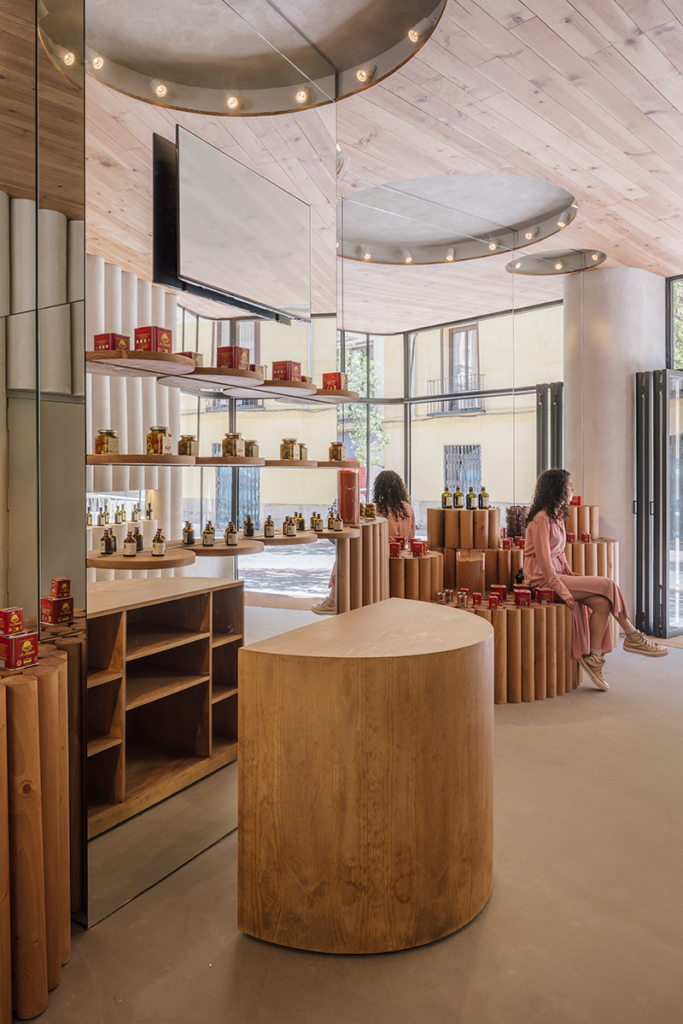El interior de la tienda está compuesto por cilindros verticales que simbolizan los troncos y que actúan como expositores circulares para mostrar los variados productos de pimentón ahumado.