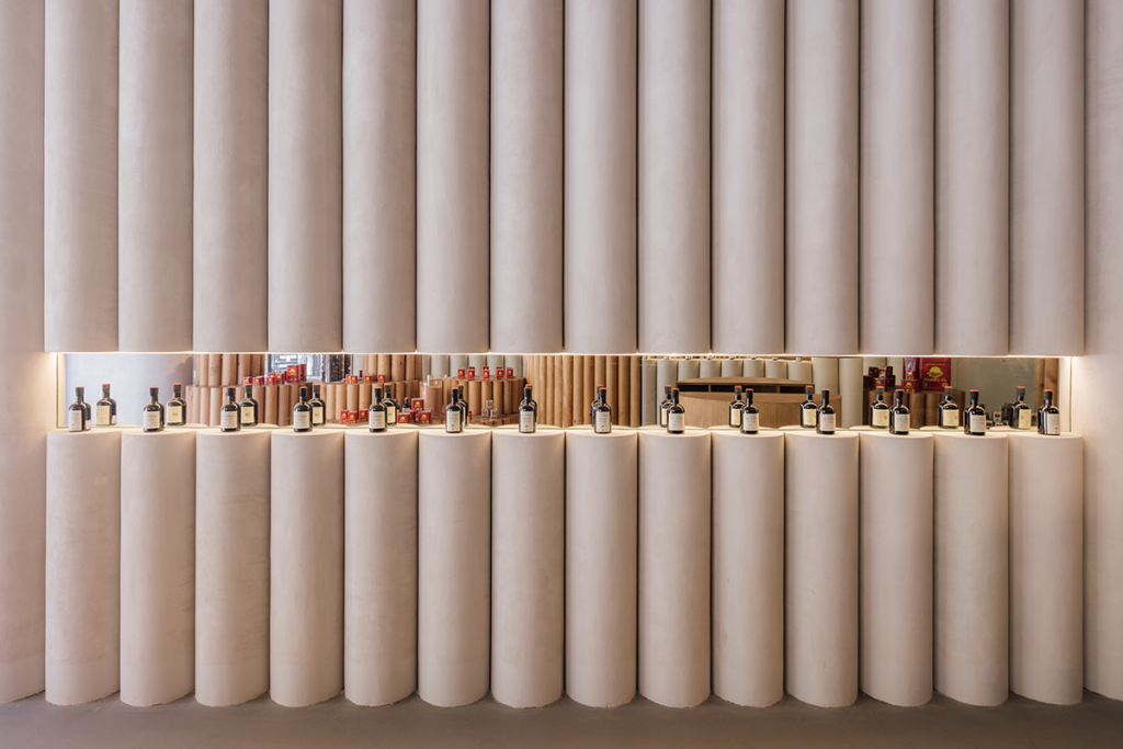 Estos cilindros también se reflejarán en el techo, donde se crean cavidades vacías para alojar la iluminación, generando así un ambiente cálido y acogedor que evoca la esencia de un antiguo almacén de maderas aromáticas.