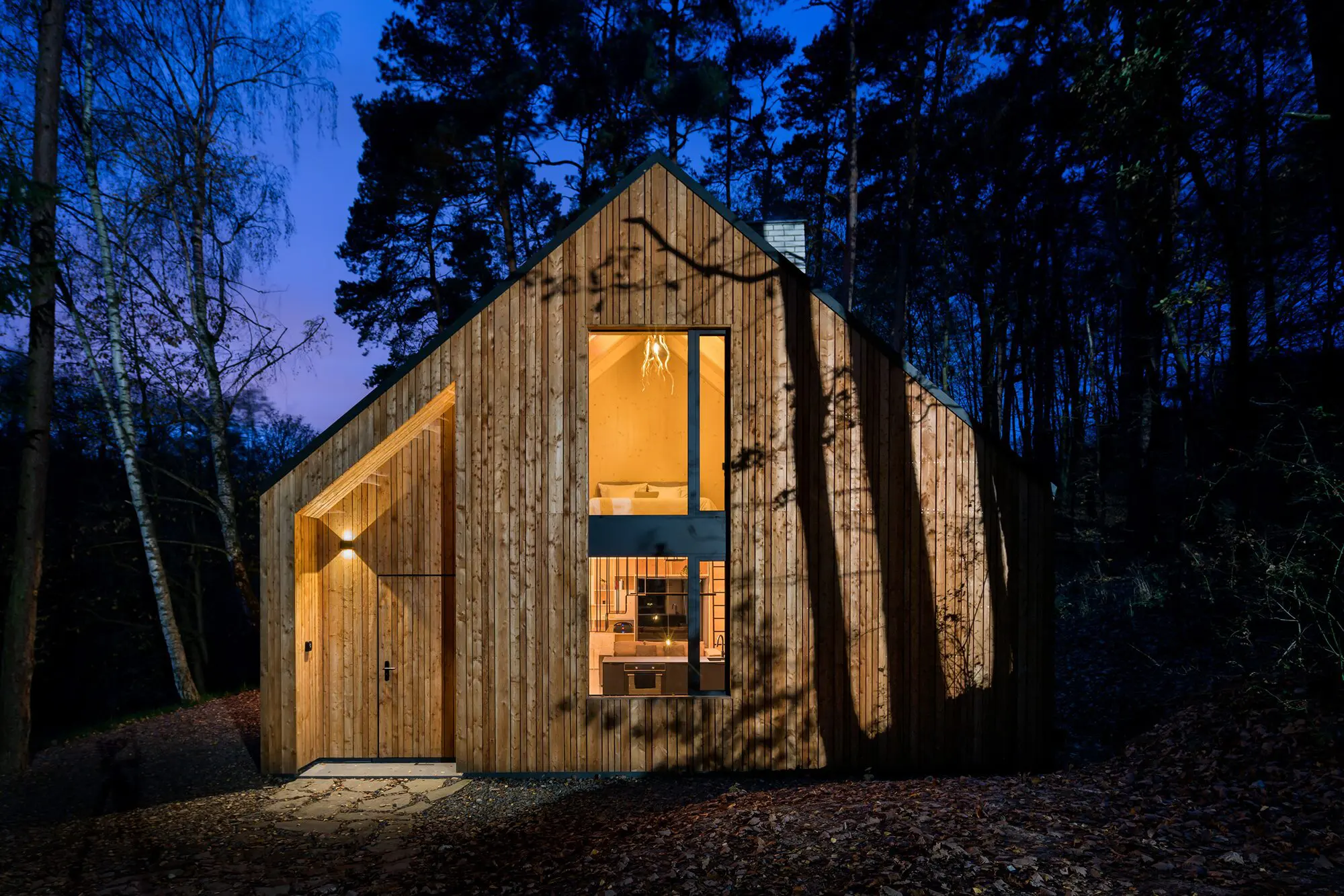 Al igual que Hytta, encarna el espíritu del minimalismo escandinavo y, gracias a su fachada de revestimiento de madera carbonizada, casi se integra con la naturaleza circundante. La construcción está anclada con tornillos de tierra y el acceso a las instalaciones se realiza a través de una rampa de acero, lo que confiere al edificio una agradable sensación de ligereza.