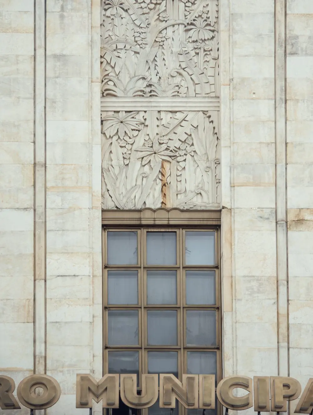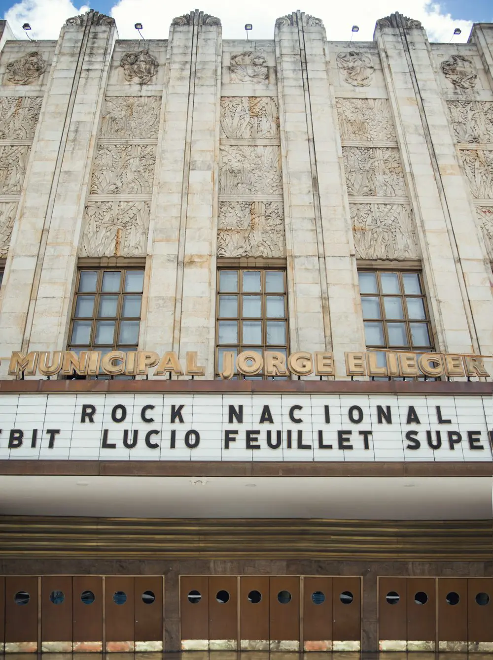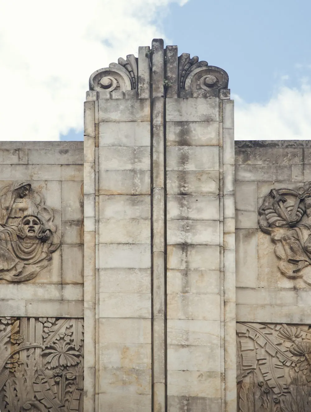 Esta misma tendencia estilística es evidente en la fachada de piedra y en particular en el trabajo realizado en ella por el escultor Bernardo Vieco (1886-1956). Vieco elaboró cinco relieves alegóricos que evocan las musas de las Bellas Artes: la tragedia, la música, la filmografía, la danza y la comedia, así como quince relieves seriados con motivos vegetales y geométricos que de manera magistral, y como lo había hecho anteriormente en su obra, logran conciliar de una forma indisoluble el arte con la arquitectura.