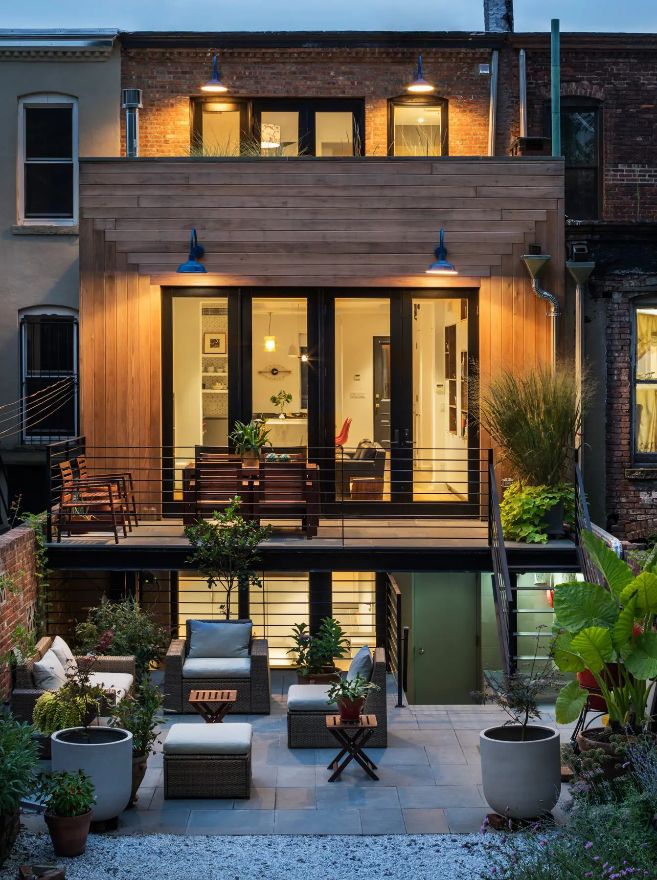 En la planta superior, una envolvente pintada de color gris azulado crea una cabecera de gran tamaño en el dormitorio principal, que da a una cubierta de techo con plantas.