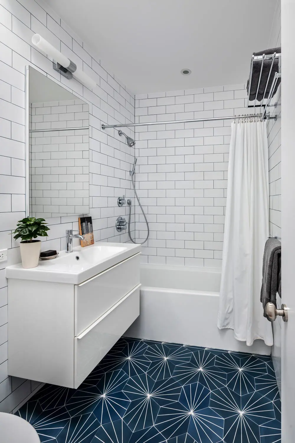El baño principal cuenta con una losa de piedra gris antigua, accesorios de Waterworks y un tocador de nogal personalizado junto con azulejos económicos de la pared del metro y pisos de porcelana de Classic Tile.