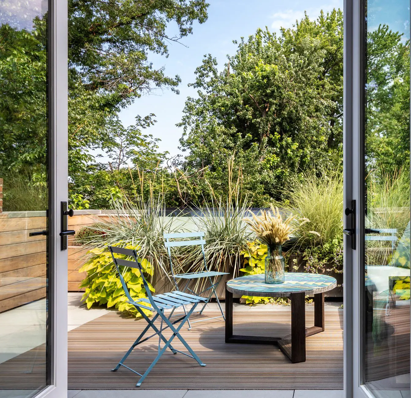 La pared trasera con ventanas da a un exuberante jardín