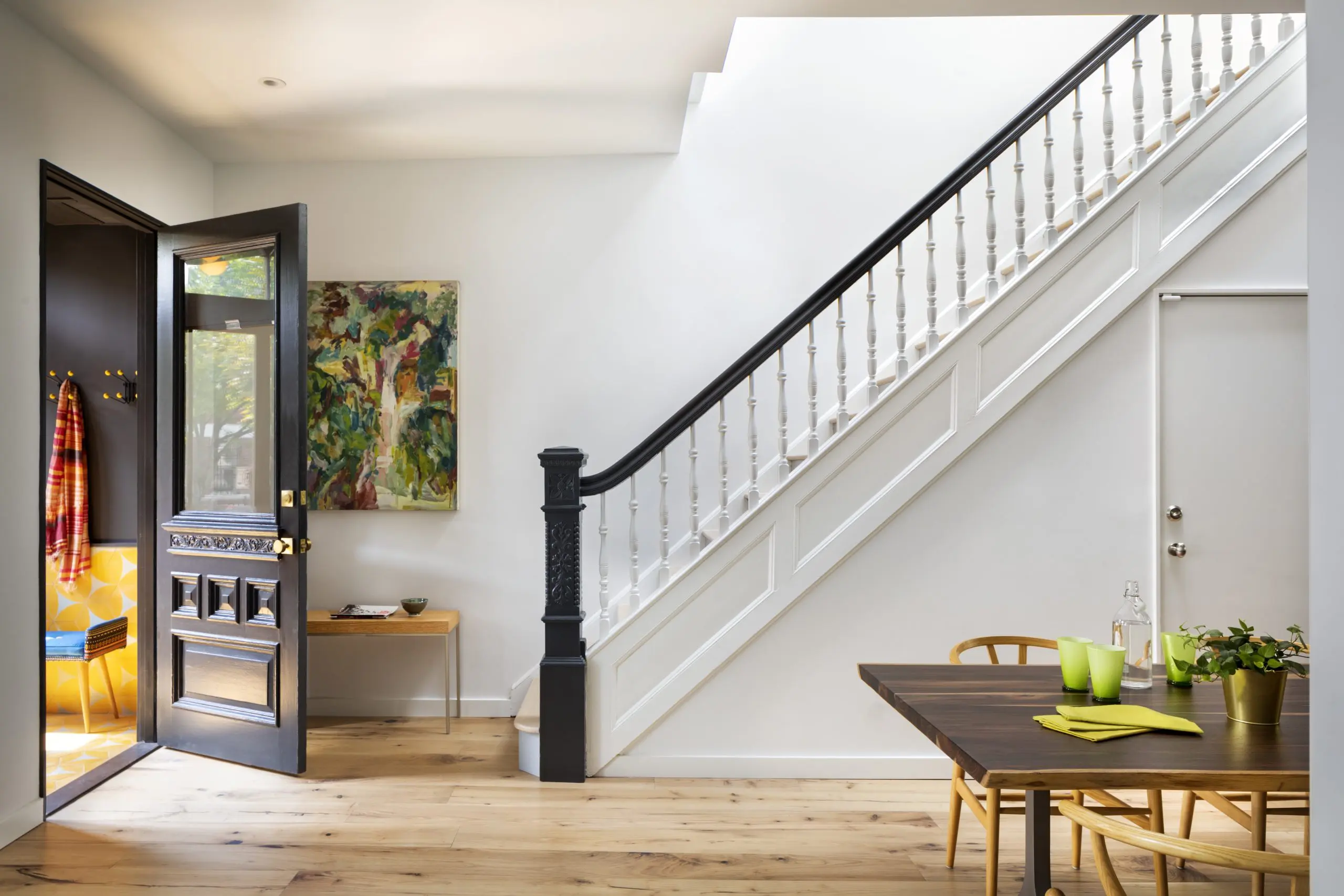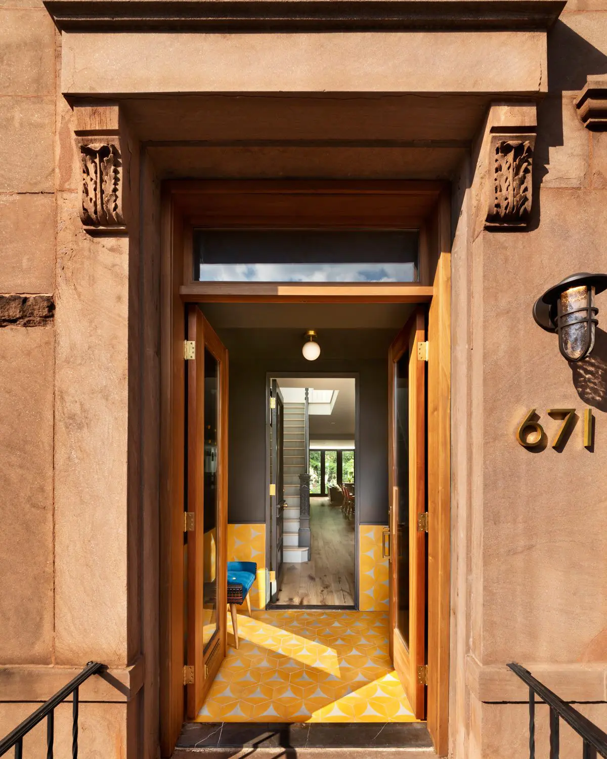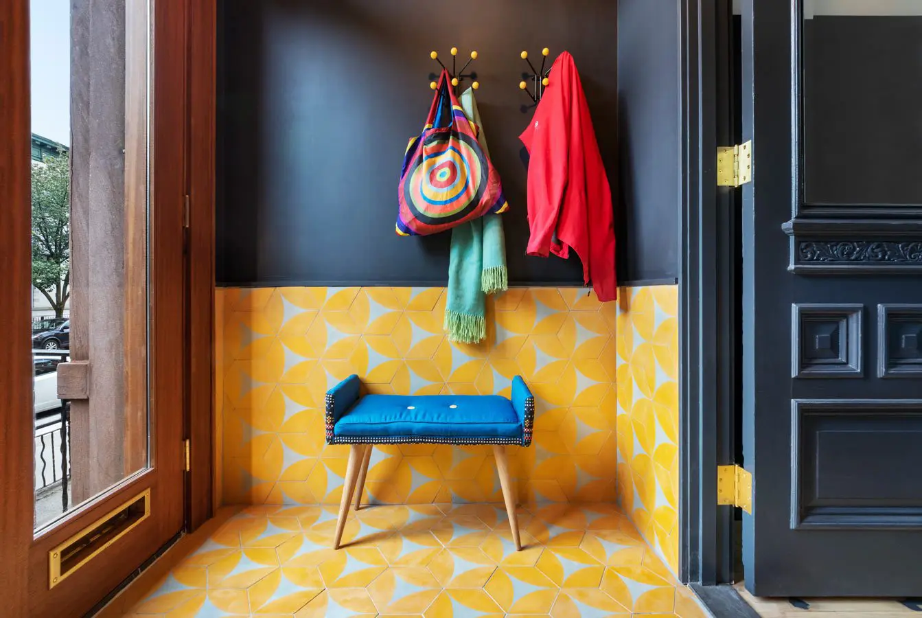 El vestíbulo de entrada está revestido en azulejos naranja y amarillo de Brothers Cement Tile, con la puerta interior original en repintado y pintado de un color gris oscuro.