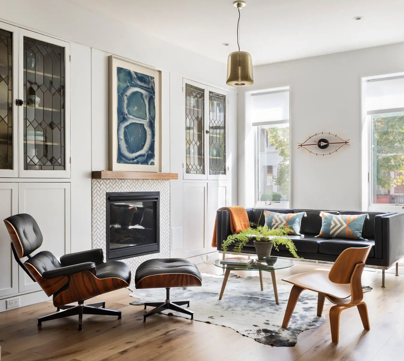 En la sala, las puertas de los gabinetes de vidrio con plomo originales se montan en cajas de gabinetes nuevas para flanquear la chimenea de gas.