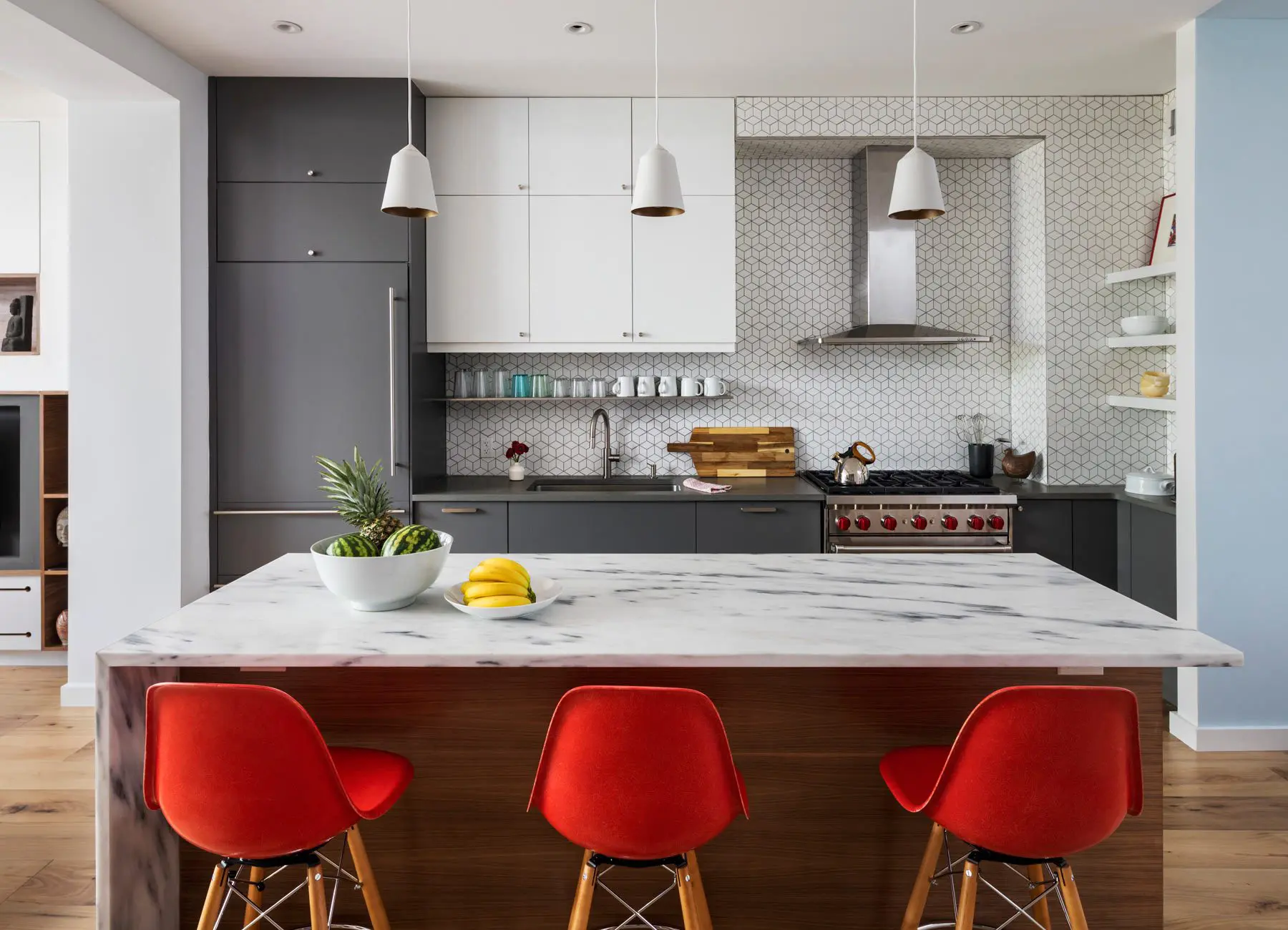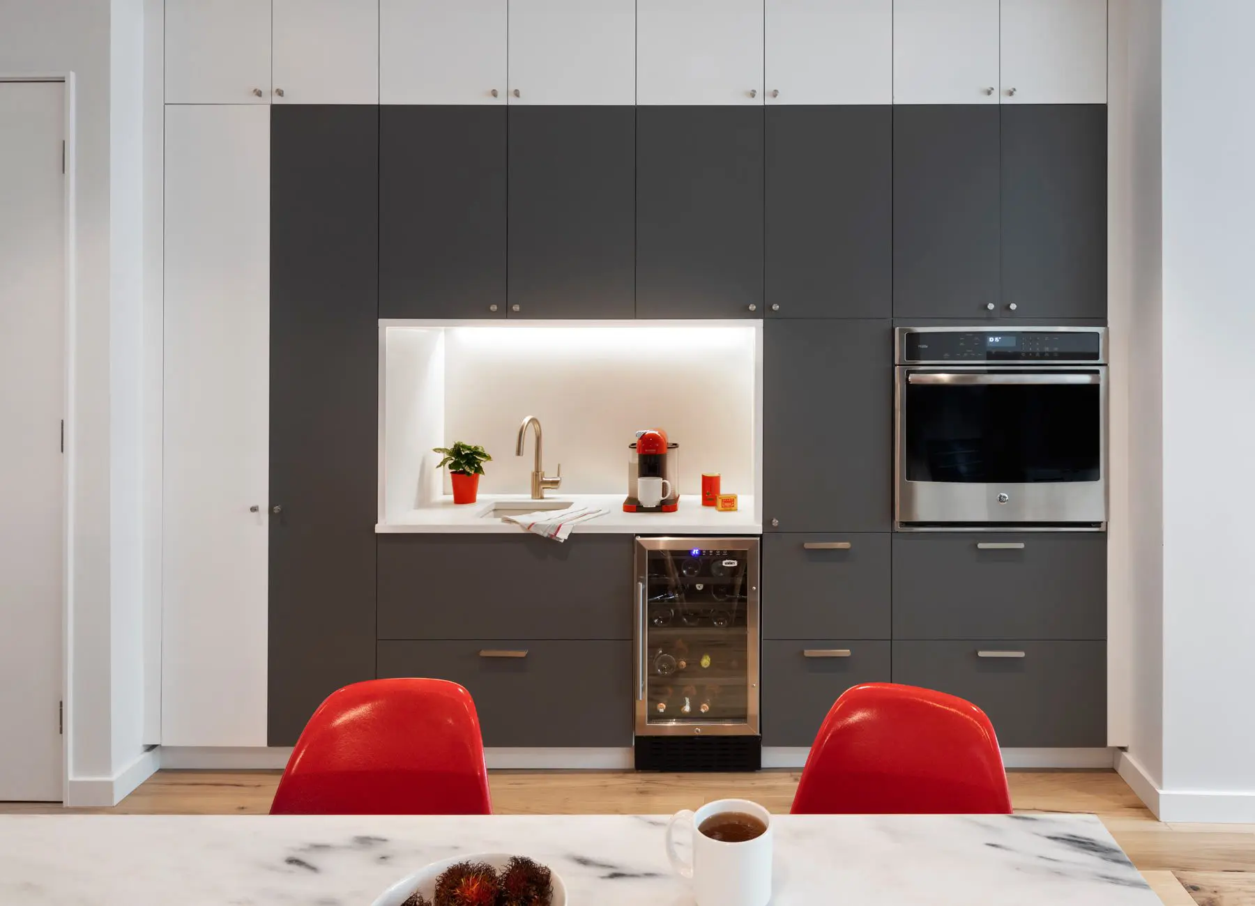 Las cajas de Ikea con puertas pintadas en gris y blanco fabricadas en el lugar comprenden la cocina y el bar