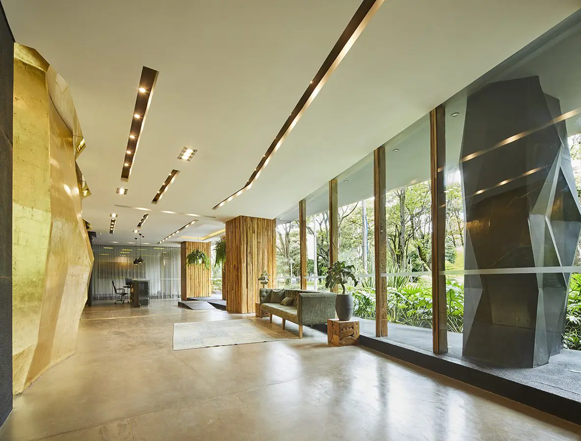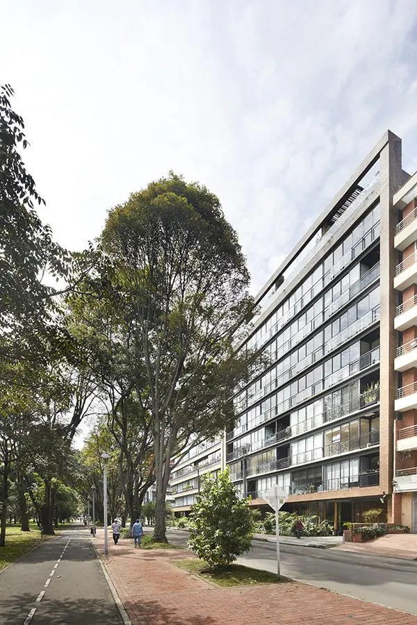 El edificio al que se refiere es Kubik Virrey I y II, el primer desarrollo de carácter residencial en Bogotá reconocido con la certificación LEED en categoría Gold. Ubicado sobre el parque El Virrey, al norte de la ciudad, su concepto arquitectónico gira sobre cómo involucrar el entorno al inmueble, cómo abrirlo hacia la naturaleza. “El parque es una joya”, afirma. Al poner a dialogar el proyecto con el parque, el arquitecto decidió hacerlo a través de una obra de arte. El artista Nicolás Cárdenas creó una roca de oro que dispuso en el primer piso, embebida dentro de la naturaleza mientras acompaña el acceso. Los bancos de concreto que conforman recintos dentro del antejardín difuminan los límites y ofrecen una interacción más cercana entre el interior y la ciudad. Esta íntima relación entre lo privado y lo público lo hizo también merecedor del premio Cemex al espacio colectivo.