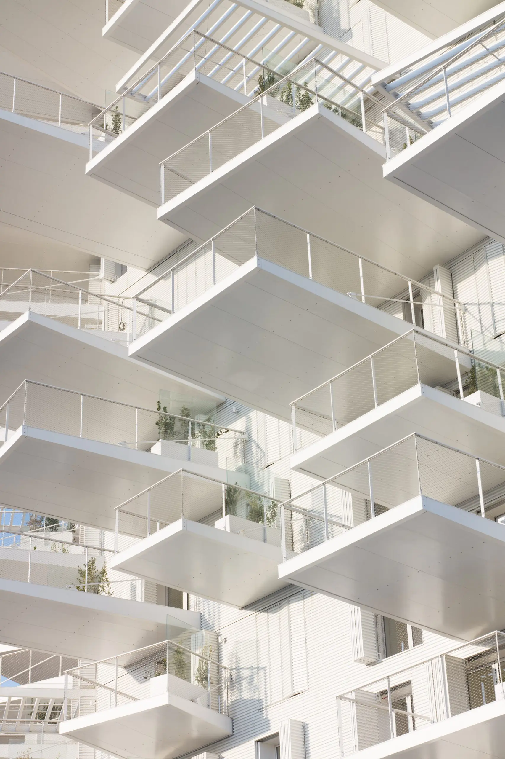Aquí el equivalente al antejardín –ese espacio privado pero exterior– se construye en el aire para generar un contacto entre los moradores y promover un modo de vida volcado hacia afuera. Por otro lado, estas plataformas protegen los interiores del sol y contribuyen así a disminuir en un 30 % la energía requerida para el enfriamiento de los apartamentos en los meses de verano.