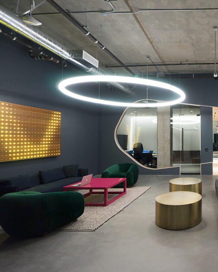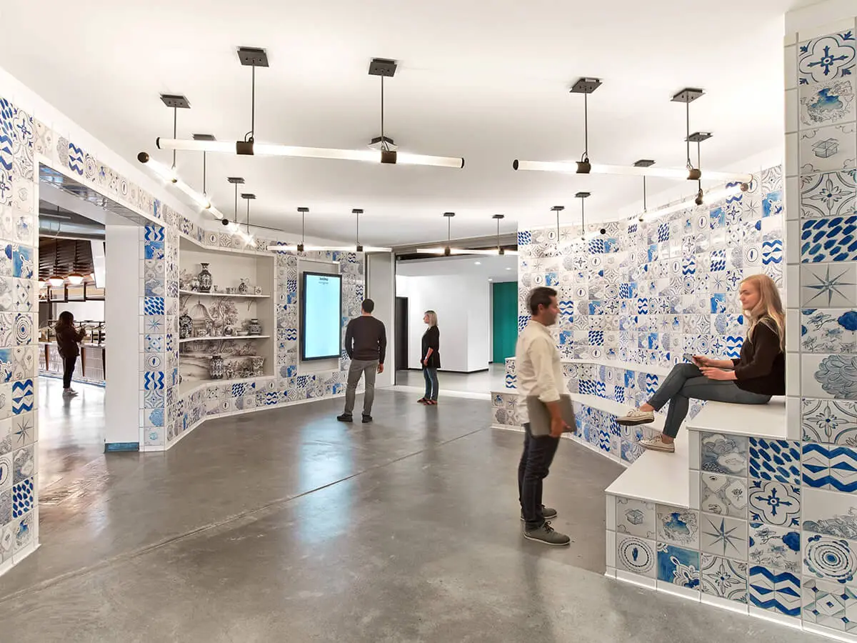 Los enormes espejos en el lobby de Dropbox ayudan a borrar el límite entre la empresa y la comunidad que lo rodea. Cuando un peatón pasa, pueden verse reflejado. Ya adentro, una habitación dramáticamente oscura, perfecta para un doblador de codificación, la sala Deep Focus señala su uso intencionado con oscuridad, colores oscuros y líneas limpias. Convenientemente flanqueado por salas de guerra inspiradas por el Dr. Strangelove para manejar la crisis, es un destino ideal para hacerlo. Por otro lado, el bar de karaoke está inspirado en los rituales del día de la puesta en marcha de Dropbox, el Karaoke Bar es una oda a la articulación del barrio favorito de los empleados de San Francisco, The Mint. “En el espíritu del sótano de tu mamá hippie, es el lugar perfecto para atascarte o para unirte a las Horas Felices de los viernes”, comentan los diseñadores de Rapt Studio.La aldea de dropbox en california