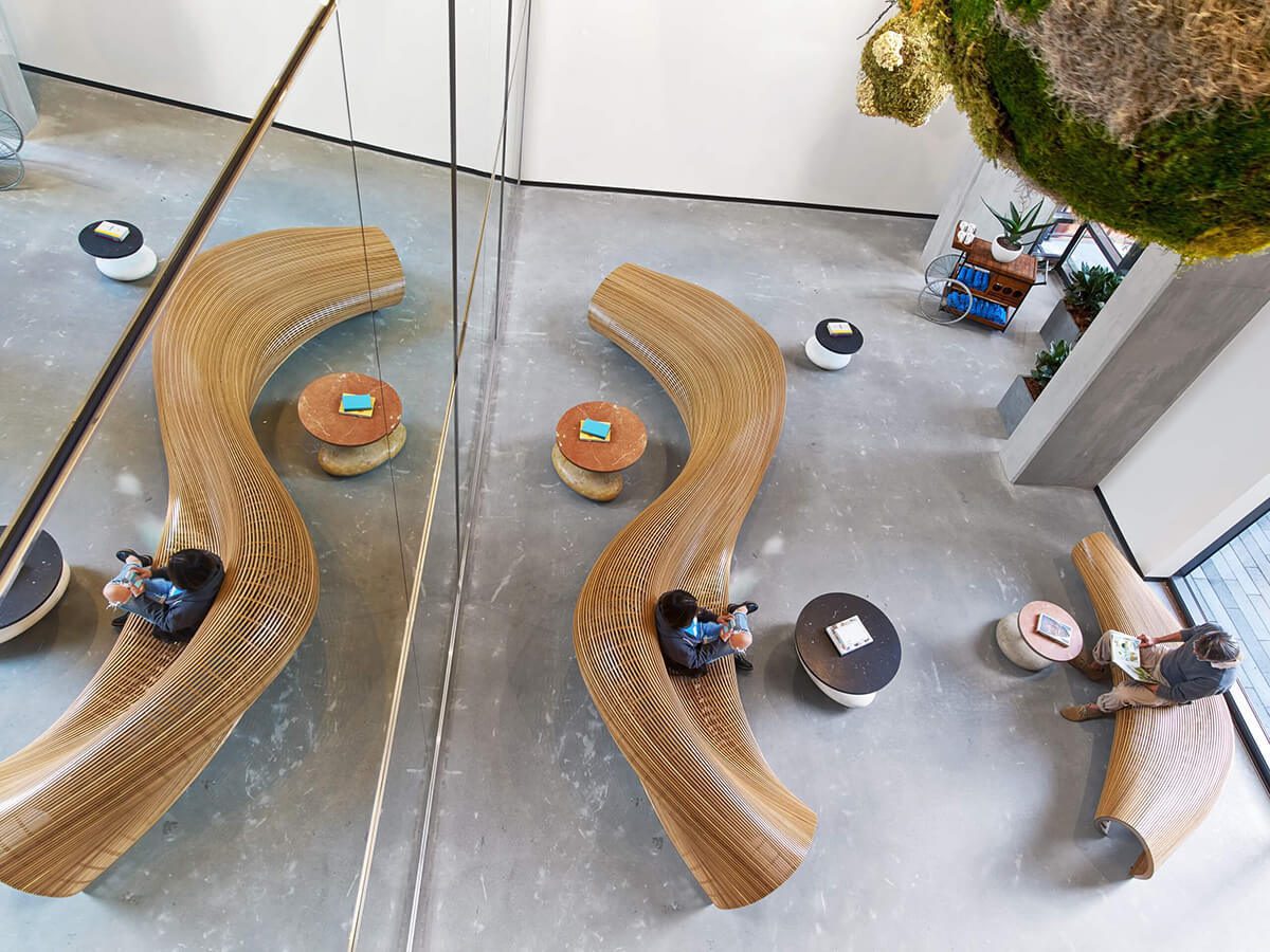 Las oficinas centrales de Dropbox están diseñadas como un pueblo radial cuyos vecindarios están empapados de un carácter distintivo que no es solo intelectual, sino físico. Mientras que el producto y el espacio de Dropbox están vinculados por principio, divergen por diseño. A diferencia de la interfaz de usuario mínima y continua de la aplicación Dropbox, la sensación en la sede de compañía varía dramáticamente. La diversidad en escala, material, color y señales sensoriales crean espacios diferenciados para diferentes estados de ánimo y estilos de trabajo. De esta manera, navegar por el gran edificio se vuelve como navegar por una ciudad, usando diferentes puntos de referencia, destinos y vecindarios como referencia. “La nueva sede de Dropbox era necesaria para empoderar a la empresa a una escala completamente nueva. Más allá de mejorar la colaboración y la productividad, queríamos ayudar a los empleados a conectarse tanto con la misión común como con su propia comunidad íntima”, aseguran los arquitectos.La aldea de dropbox en california